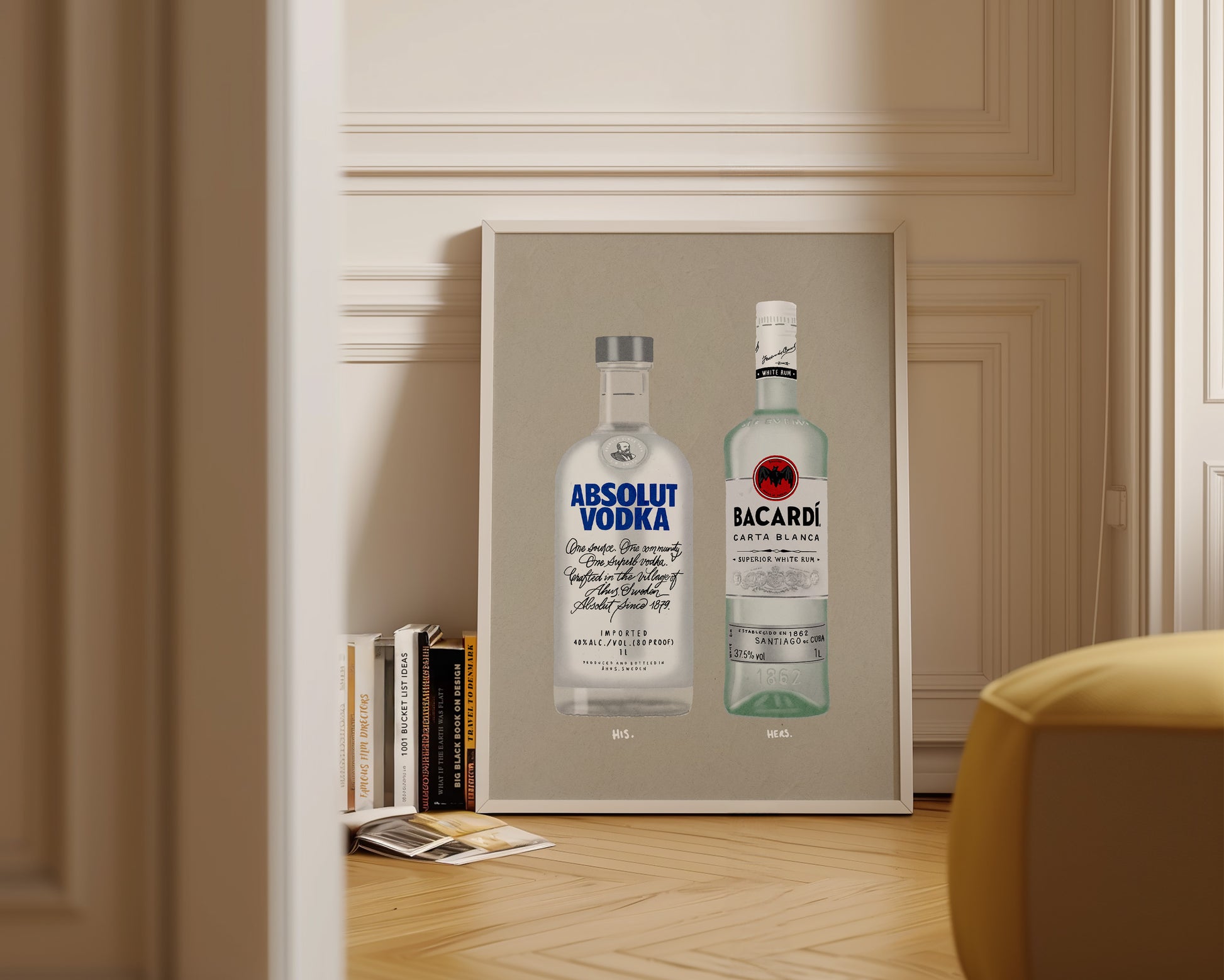 A vodka & rum print featuring hand drawn bottle of Absolut blue vodka alongside a bottle of Bacardi white rum, set against a pale green/grey background, the perfect modern kitchen print. Printed on archival matte 240gsm paper. Available in multiple sizes, with framed or unframed options. Exclusively designed by one of our artists at our studio.