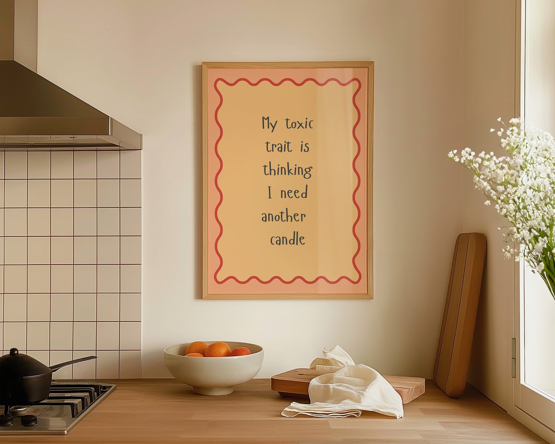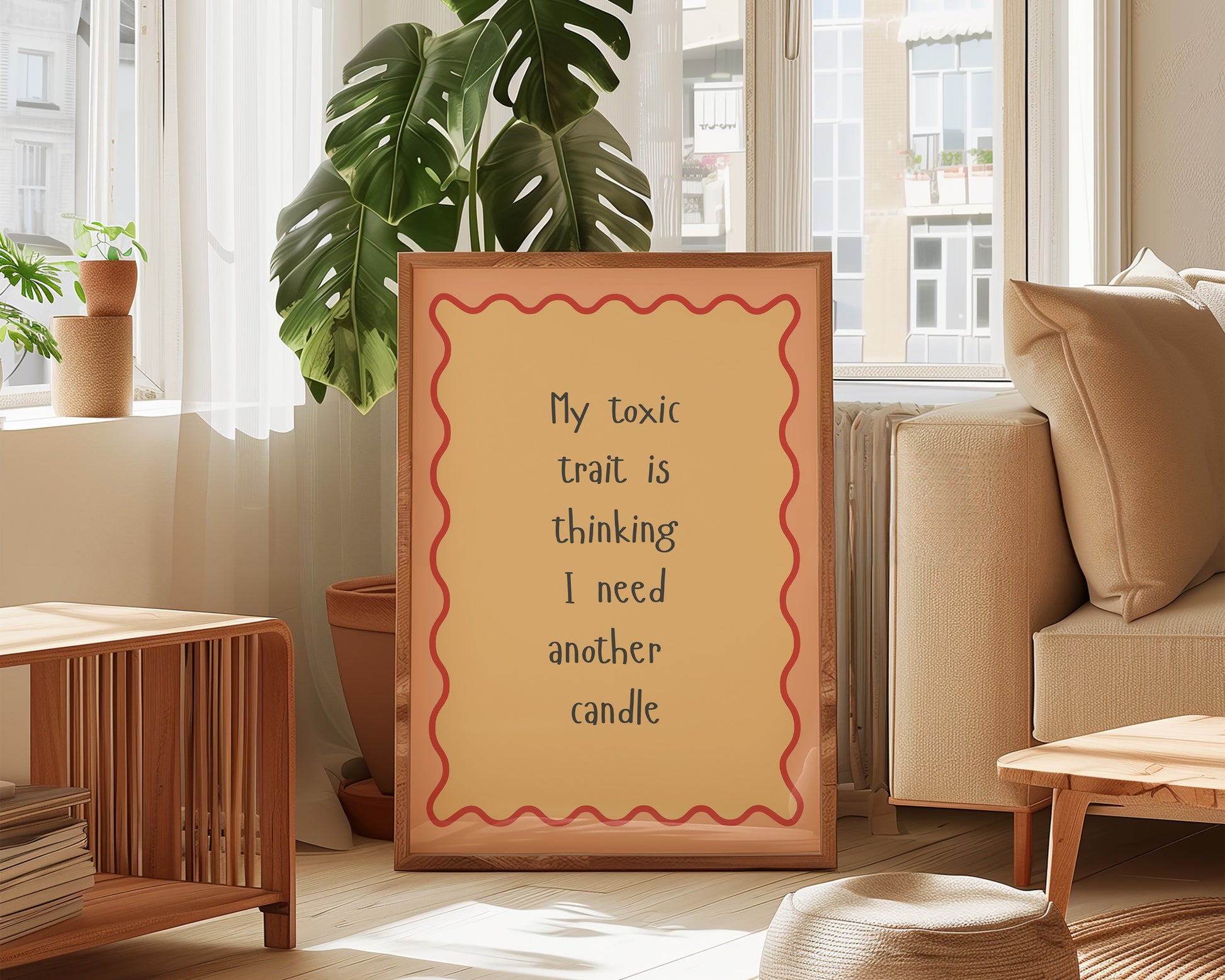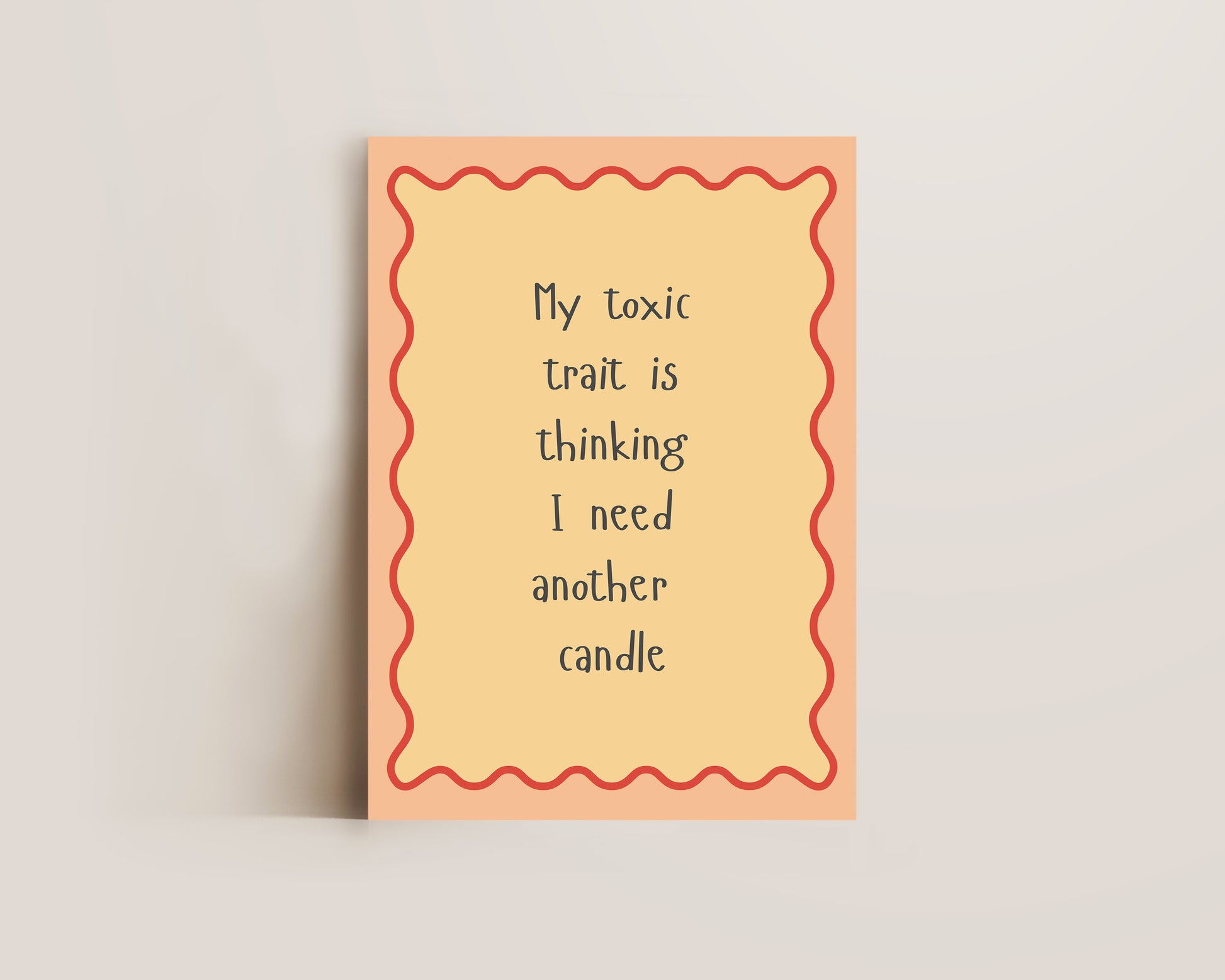 A autumnal quote print featuring "My toxic trait is thinking I need another candle" quote, set against a burnt orange border and pink background, the perfect fall print. Printed on archival matte 240gsm paper. Available in multiple sizes, with framed or unframed options. Exclusively designed by one of our artists at our studio.