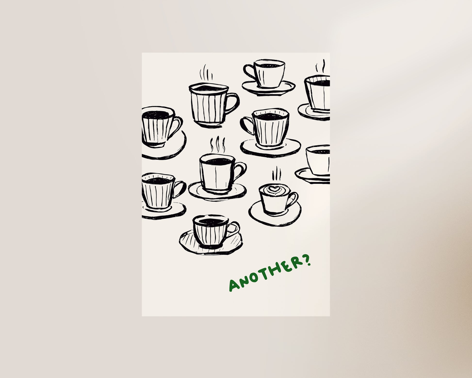 A coffee print featuring hand drawn cups of coffee, against an off white background. Exclusively designed by one of our artists at our studio.