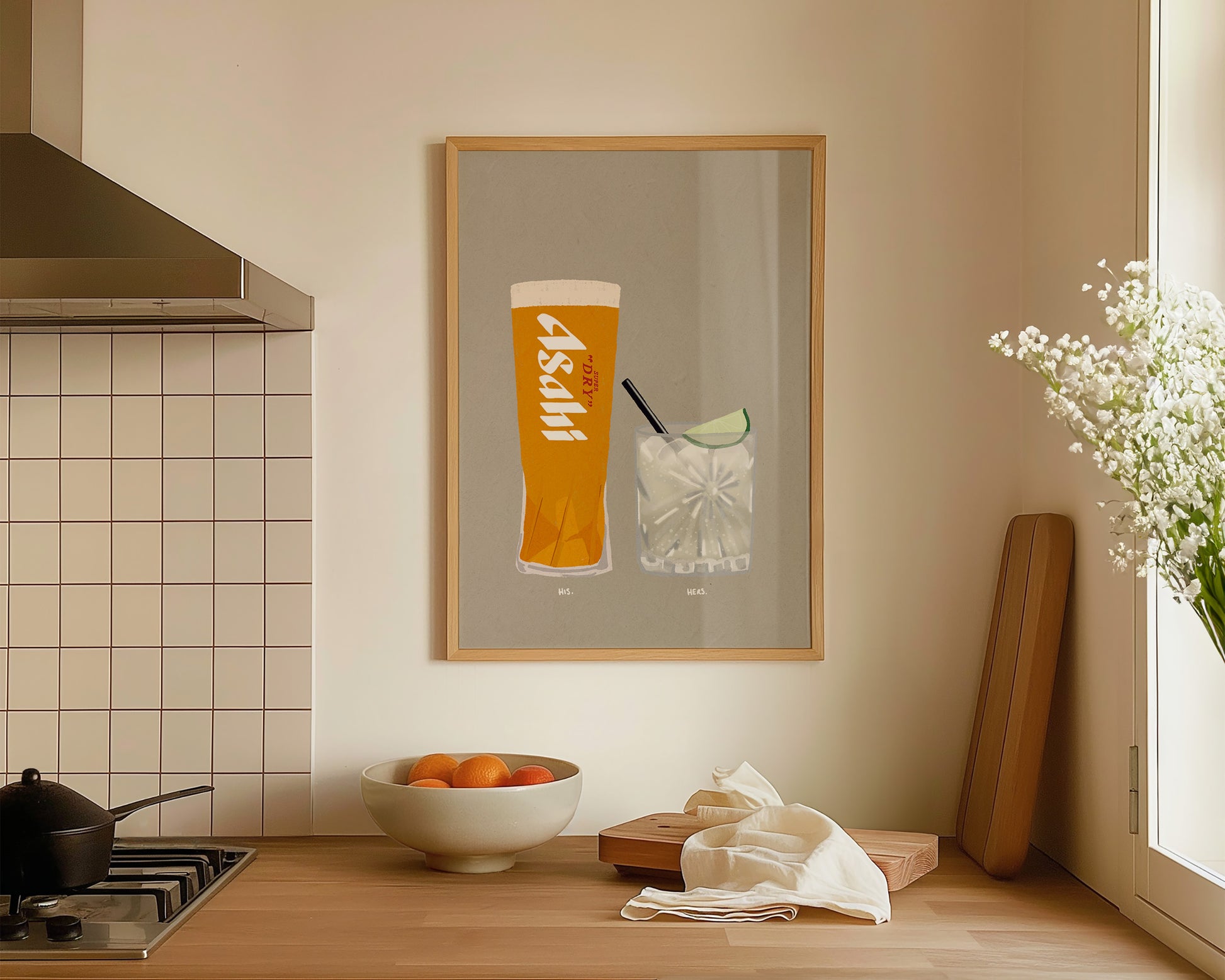 An Asahi & vodka lime print featuring hand drawn pint of Asahi alongside a vodka lime, set against a pale green/grey background, the perfect modern kitchen print. Printed on archival matte 240gsm paper. Available in multiple sizes, with framed or unframed options. Exclusively designed by one of our artists at our studio.