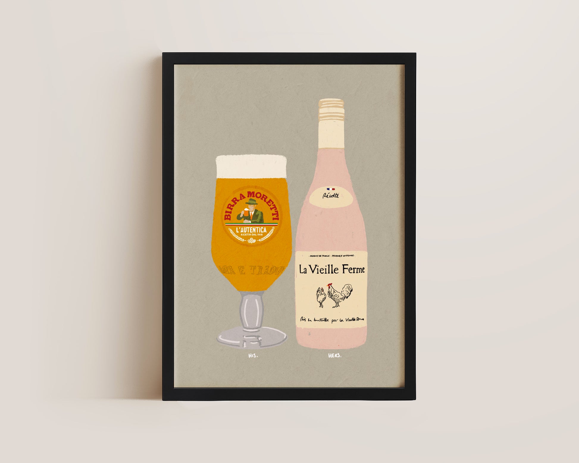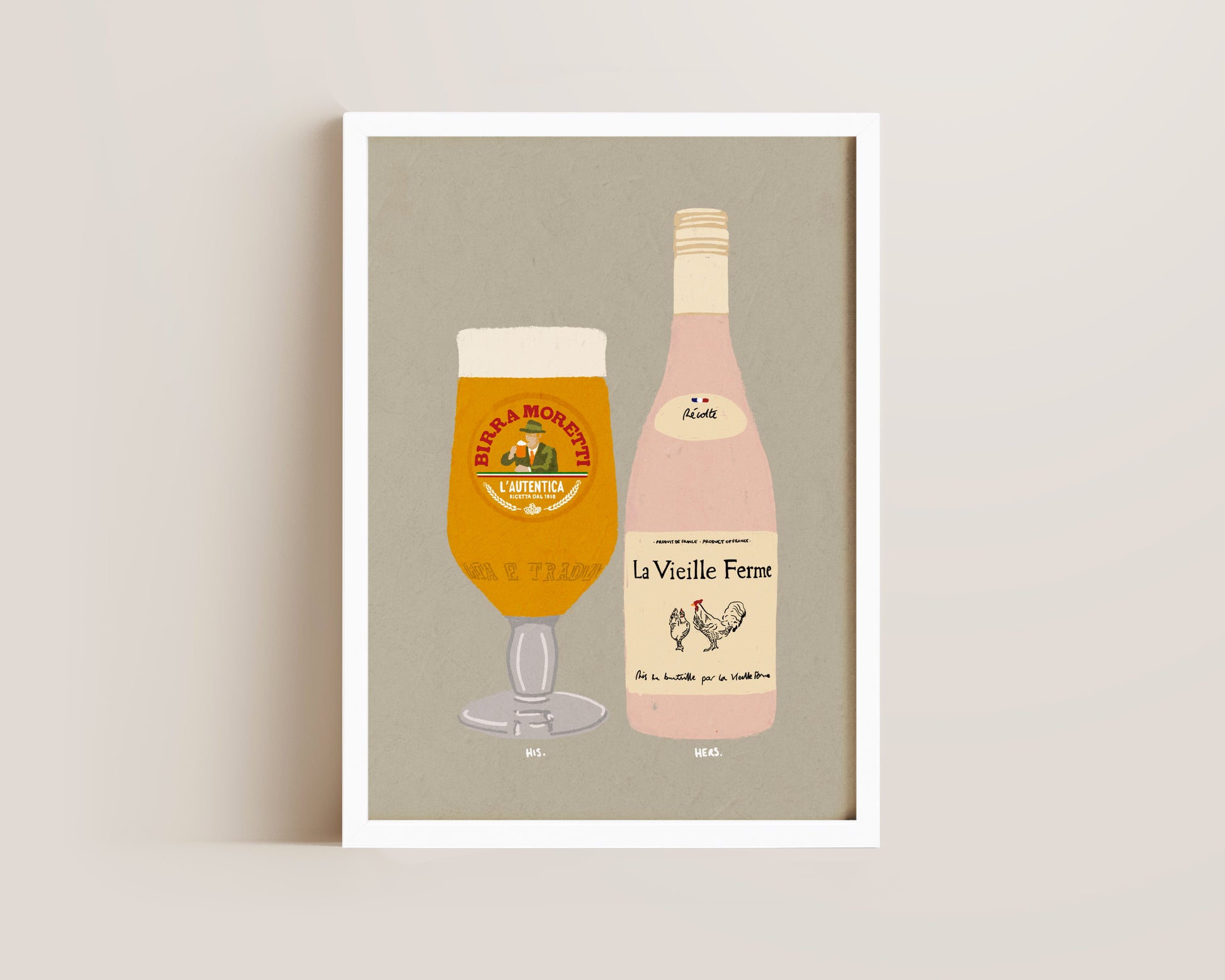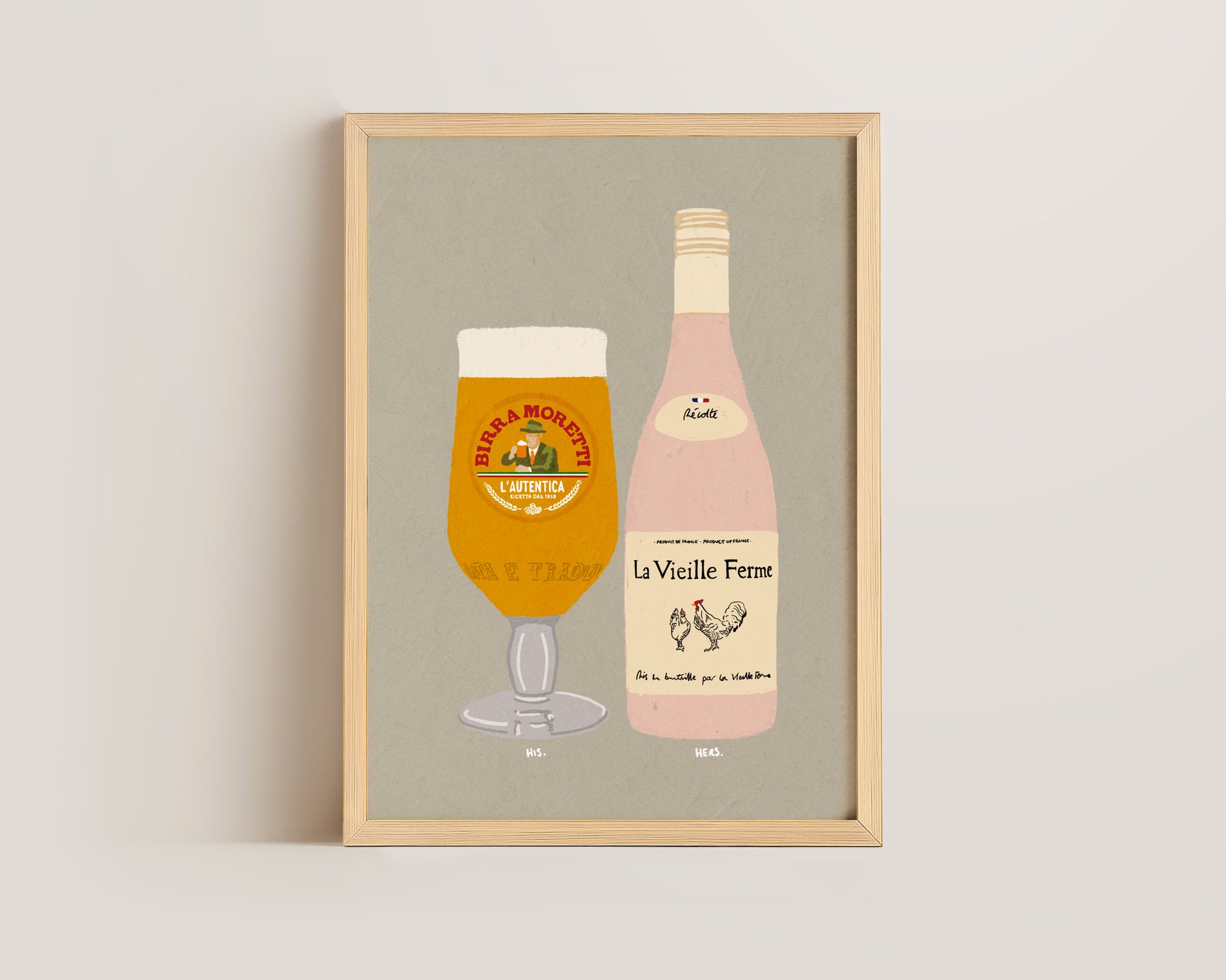 A Moretti & Chicken Wine print featuring hand drawn pint of Birra Moretti alongside a bottle of Chicken Wine, set against a pale green grey background, the perfect modern kitchen print. Printed on archival matte 240gsm paper. Available in multiple sizes, with framed or unframed options. Exclusively designed by one of our artists at our studio.