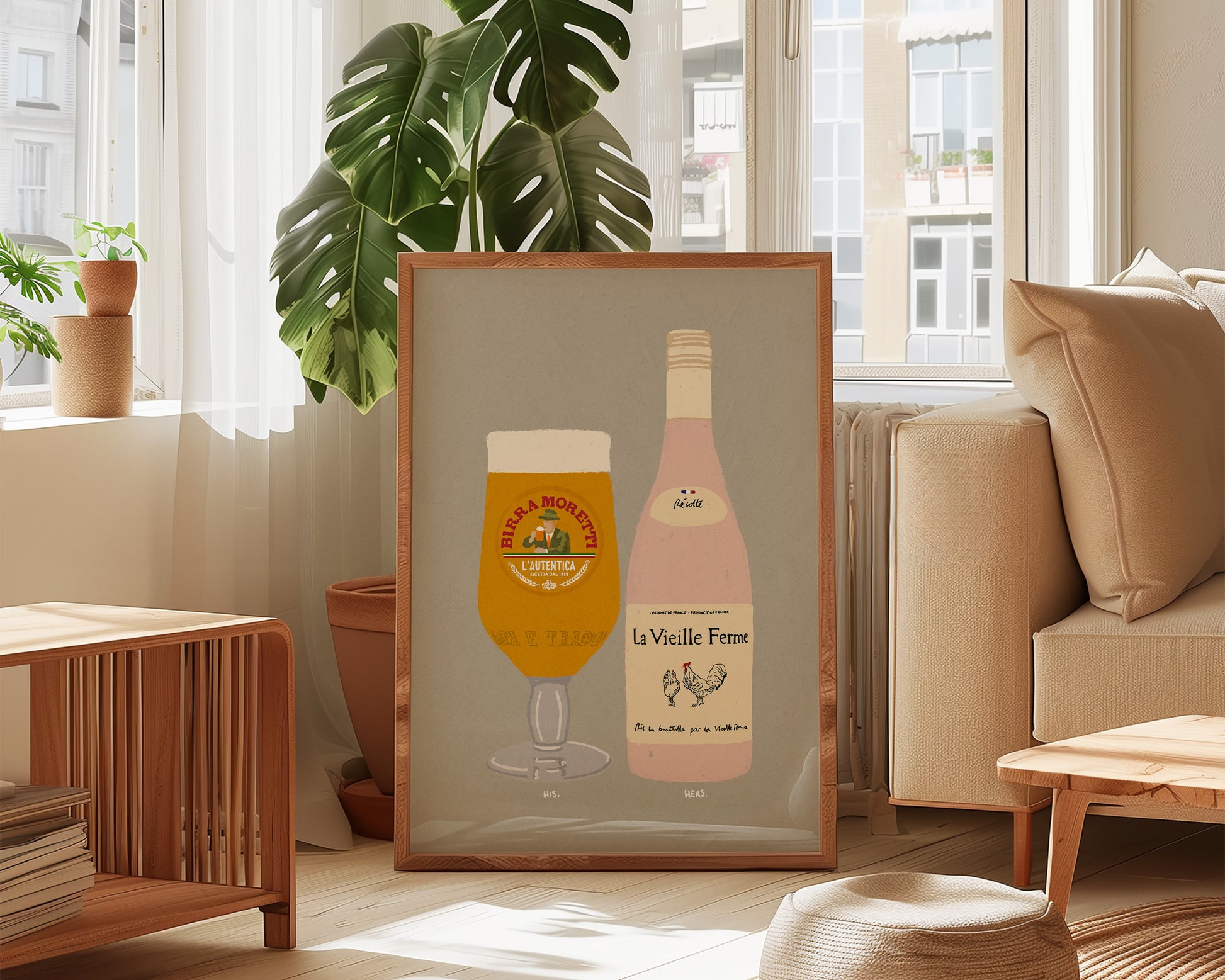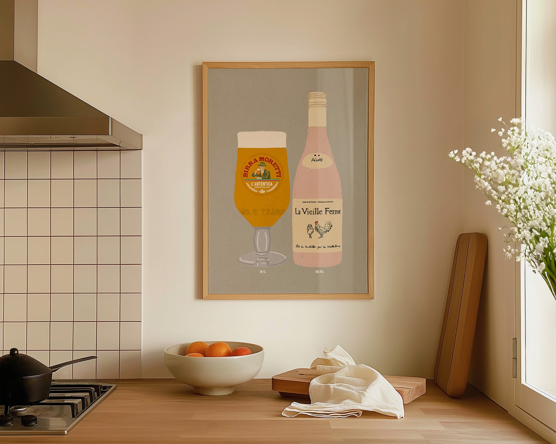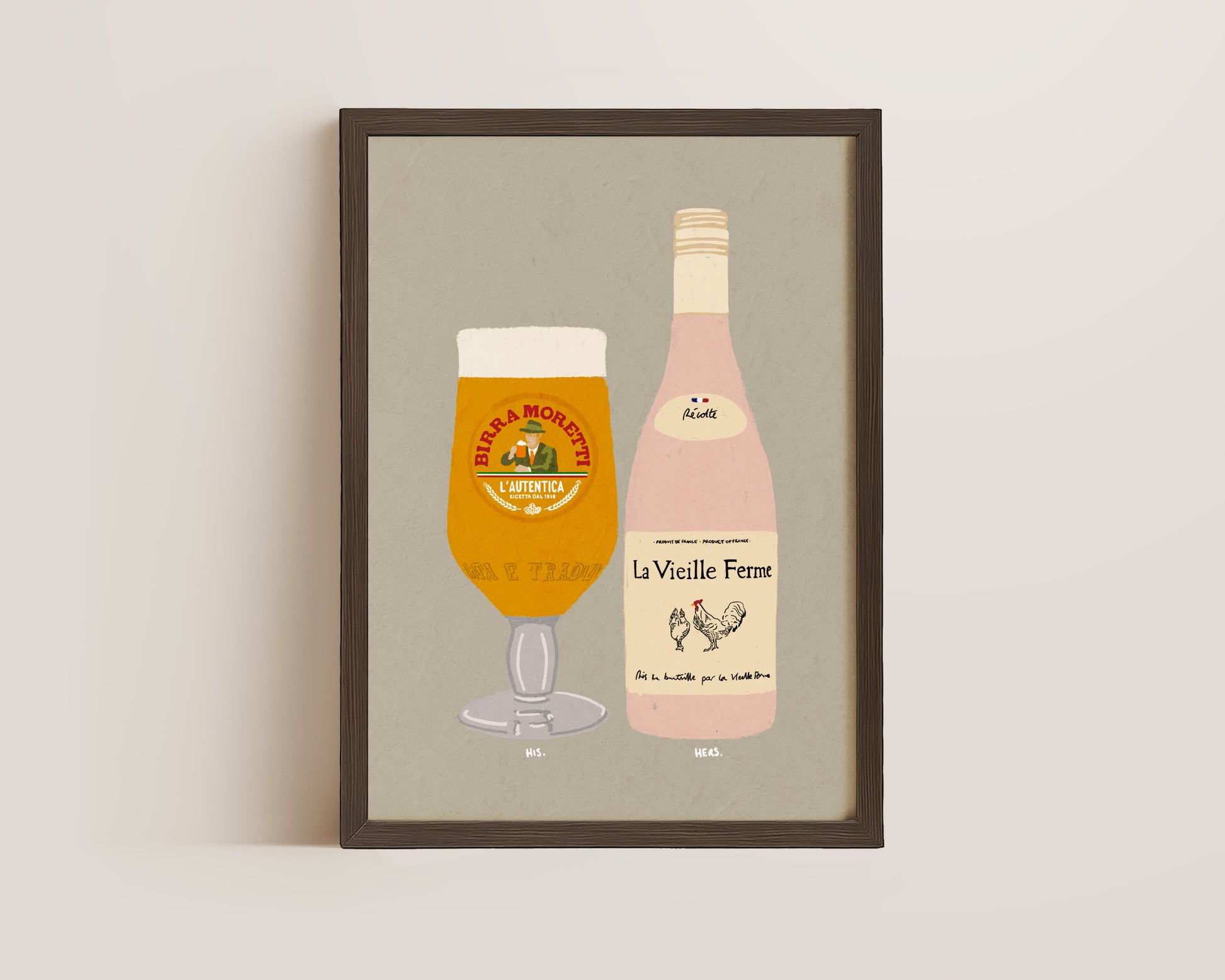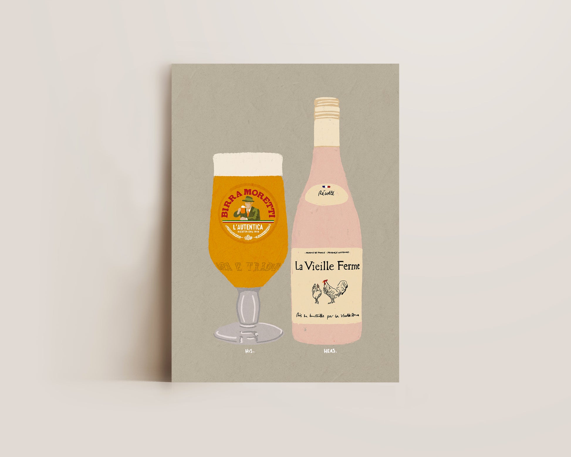 A Moretti & Chicken Wine print featuring hand drawn pint of Birra Moretti alongside a bottle of Chicken Wine, set against a pale green grey background, the perfect modern kitchen print. Printed on archival matte 240gsm paper. Available in multiple sizes, with framed or unframed options. Exclusively designed by one of our artists at our studio.