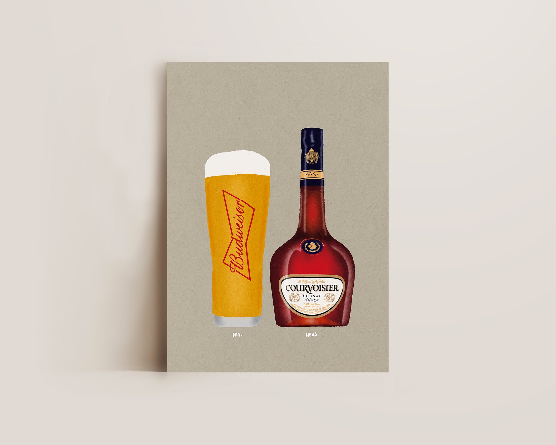 A Budweiser & Courvoisier print featuring hand drawn pint of Budweiser alongside a bottle of Courvoisier, set against a pale green/grey background, the perfect modern kitchen print. Printed on archival matte 240gsm paper. Available in multiple sizes, with framed or unframed options. Exclusively designed by one of our artists at our studio.