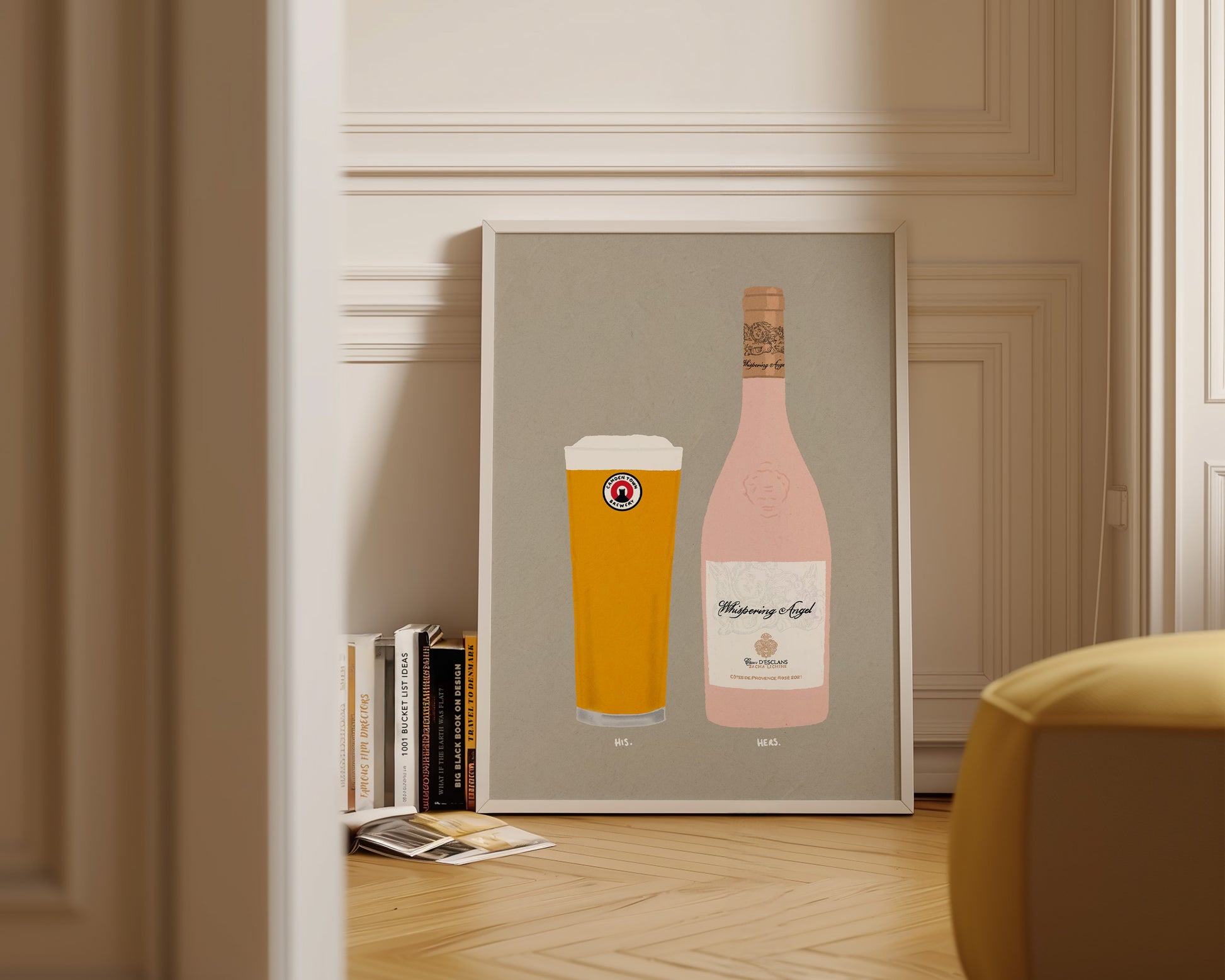 A beer and wine print featuring hand drawn pint of Camden Hells alongside a bottle of Whispering Angel, set against a pale green/grey background, the perfect modern kitchen print. Printed on archival matte 240gsm paper. Available in multiple sizes, with framed or unframed options. Exclusively designed by one of our artists at our studio.
