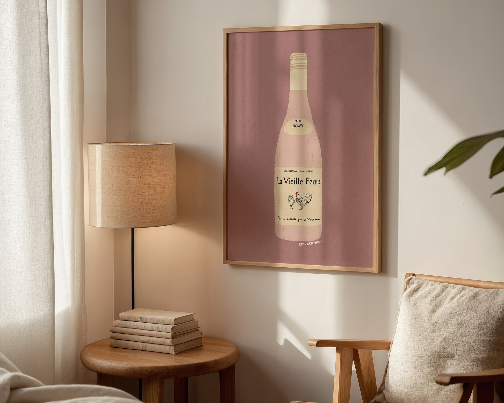 A Chicken Wine print featuring hand drawn bottle of la vieille ferme rose with chicken wine quote. Featuring a pink background. Printed on archival matte 240gsm paper. Available in multiple sizes, with framed or unframed options. Exclusively designed by one of our artists at our studio.