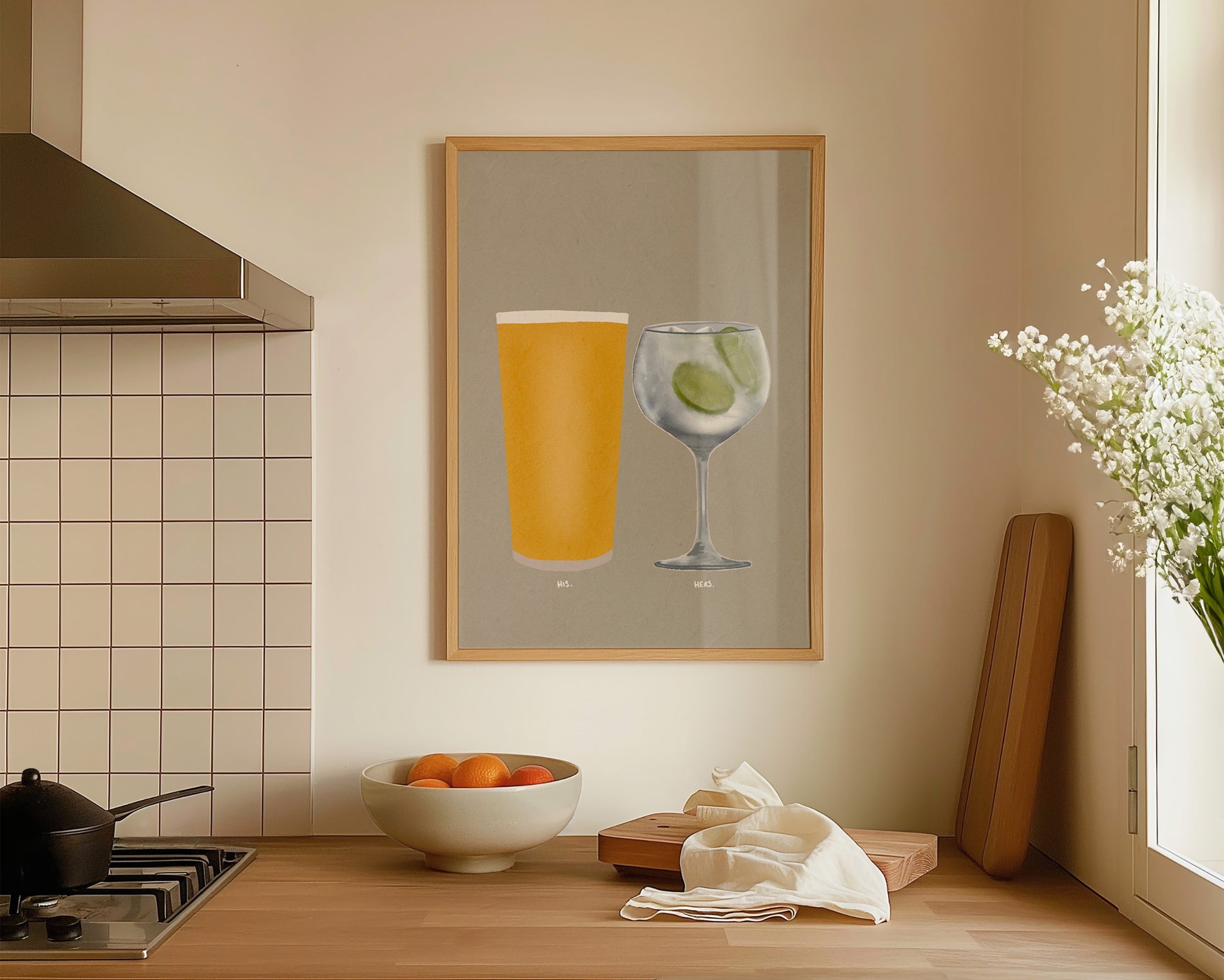 A Cider & Gin and Tonic print featuring hand drawn pint of Cider alongside a Gin and Tonic, set against a pale green/grey background, the perfect modern kitchen print. Printed on archival matte 240gsm paper. Available in multiple sizes, with framed or unframed options. Exclusively designed by one of our artists at our studio.