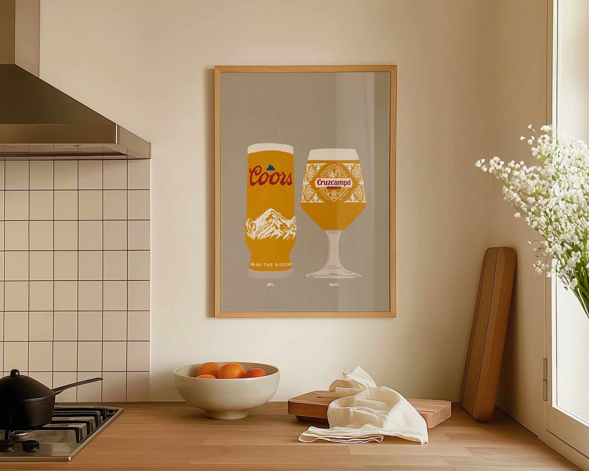 A Coors & Cruzcampo print featuring hand drawn pint of Coors alongside a pint of Cruzcampo, set against a pale green/grey background, the perfect modern kitchen print. Printed on archival matte 240gsm paper. Available in multiple sizes, with framed or unframed options. Exclusively designed by one of our artists at our studio.