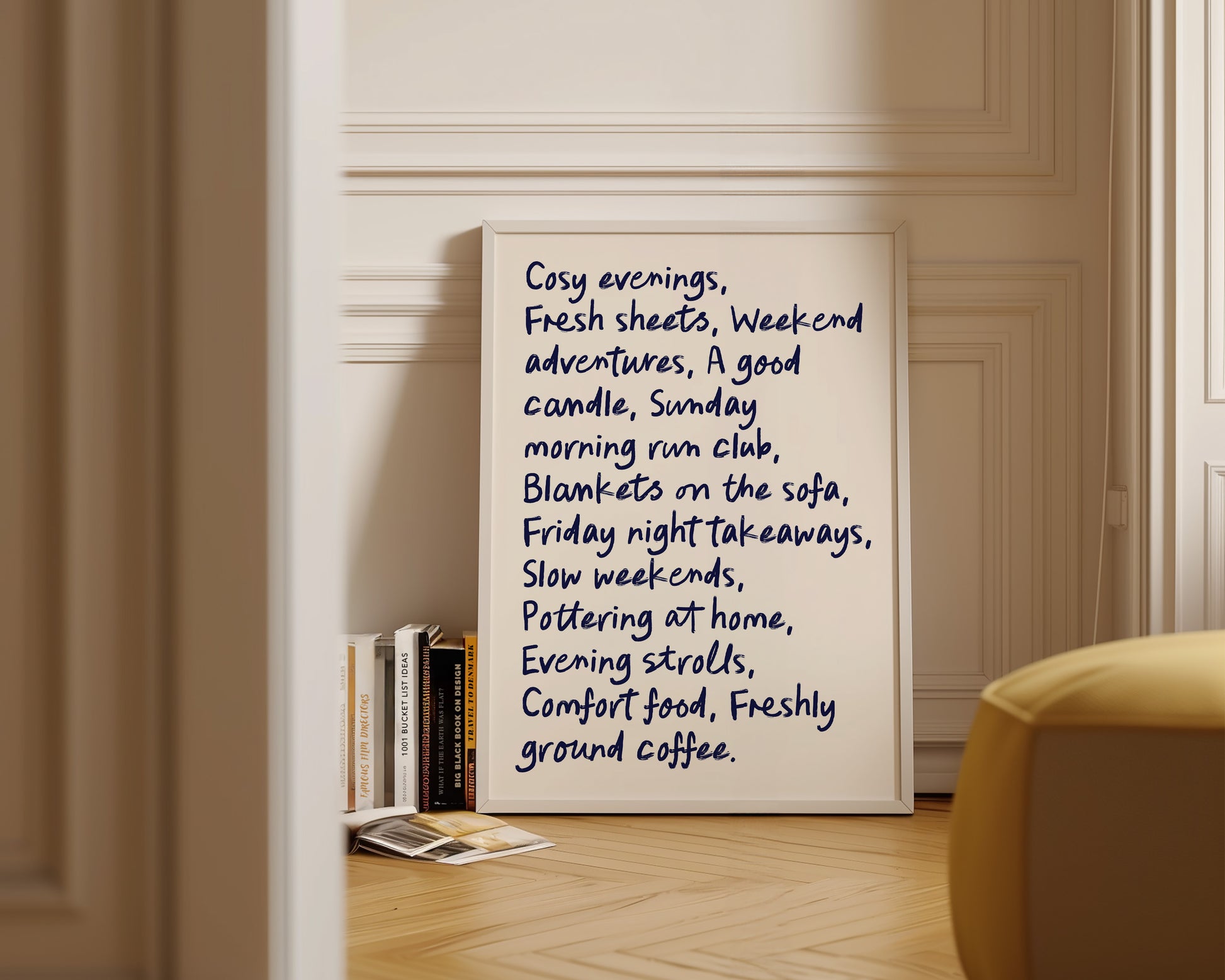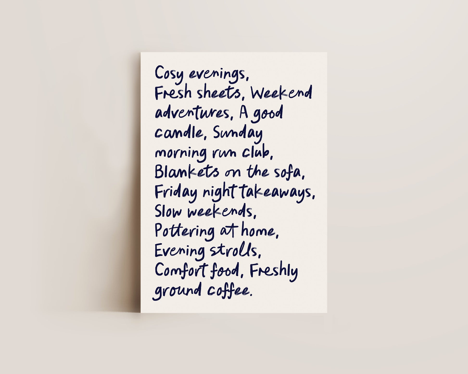 A cute quote print featuring a cosy quote in hand drawn navy font, set against a white background, the perfect cosy home print. Printed on archival matte 240gsm paper. Available in multiple sizes, with framed or unframed options. Exclusively designed by one of our artists at our studio.