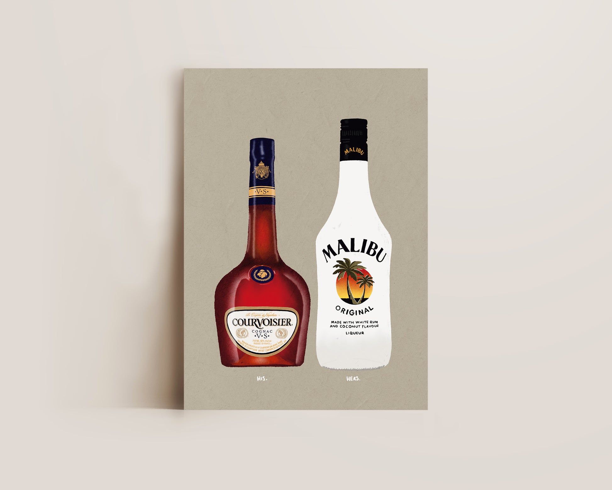 A Courvoisier & Malibu print featuring hand drawn bottle of Courvoisier alongside a bottle of Malibu, set against a pale green/grey background, the perfect modern kitchen print. Printed on archival matte 240gsm paper. Available in multiple sizes, with framed or unframed options. Exclusively designed by one of our artists at our studio.