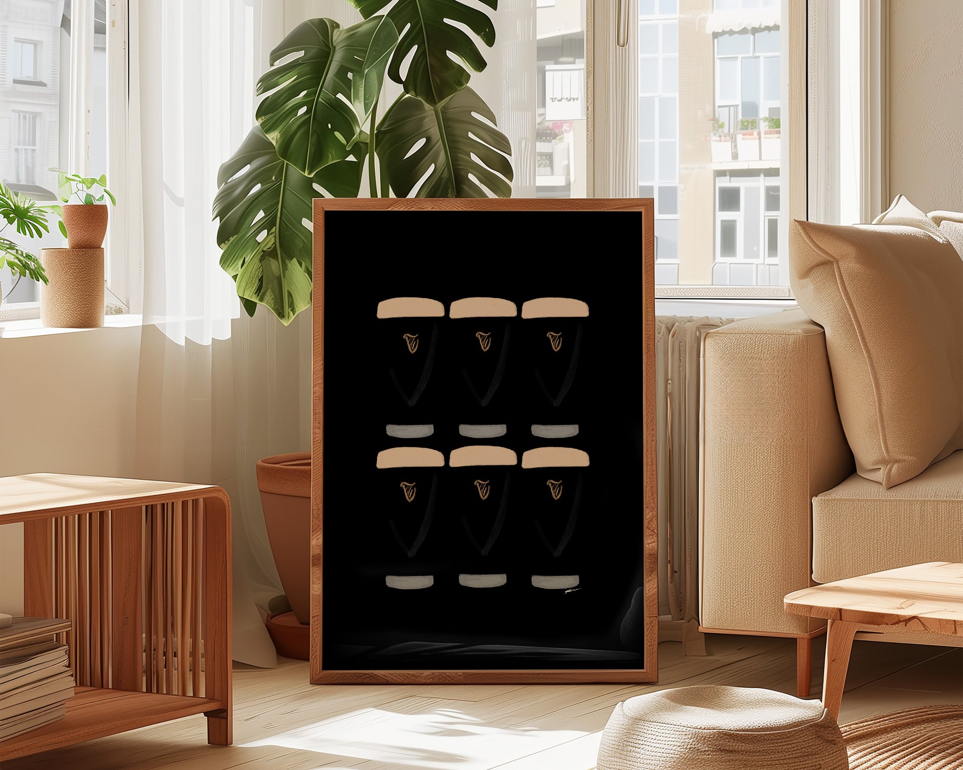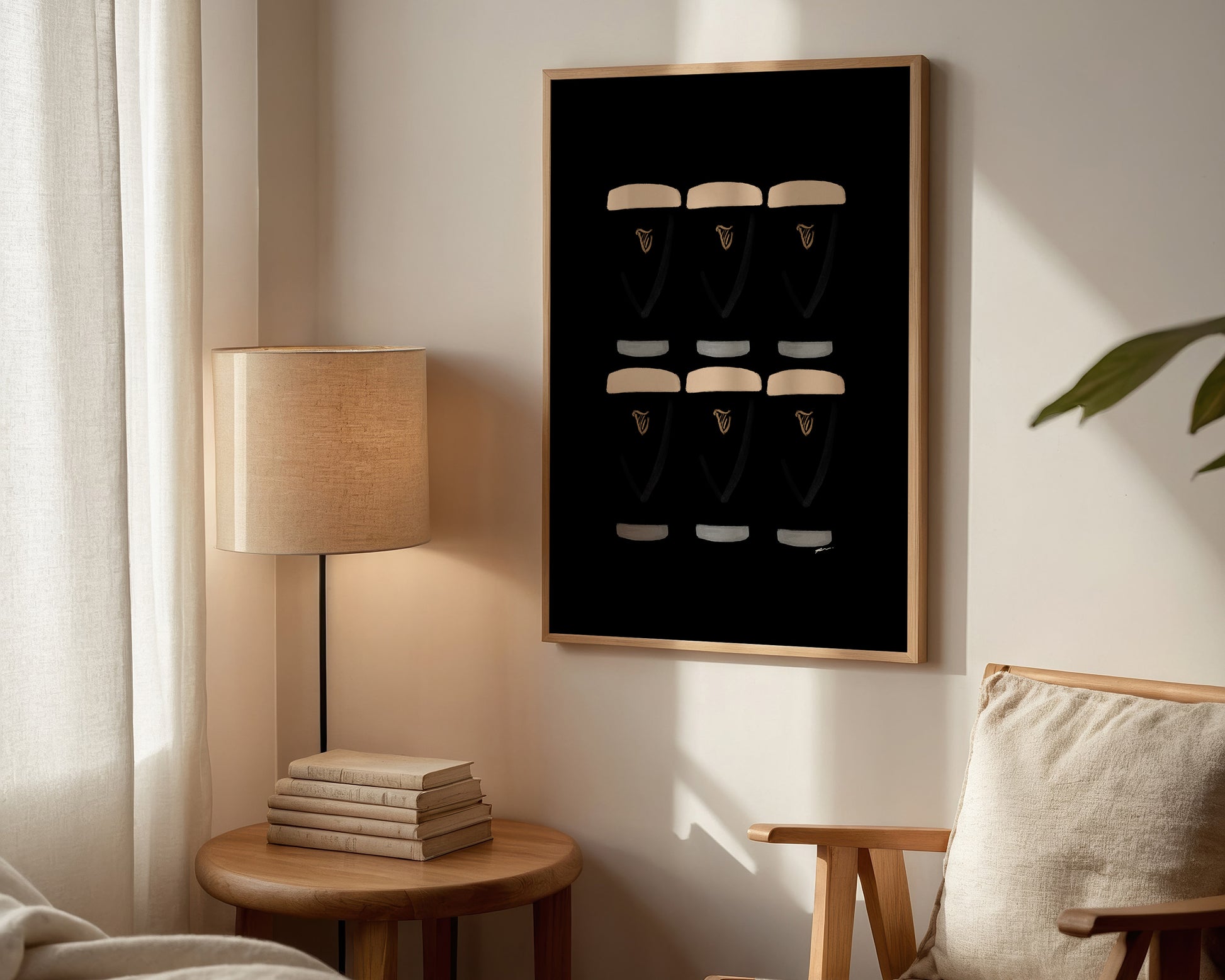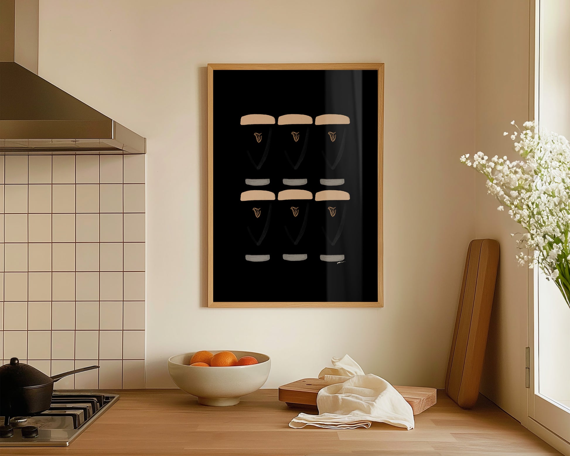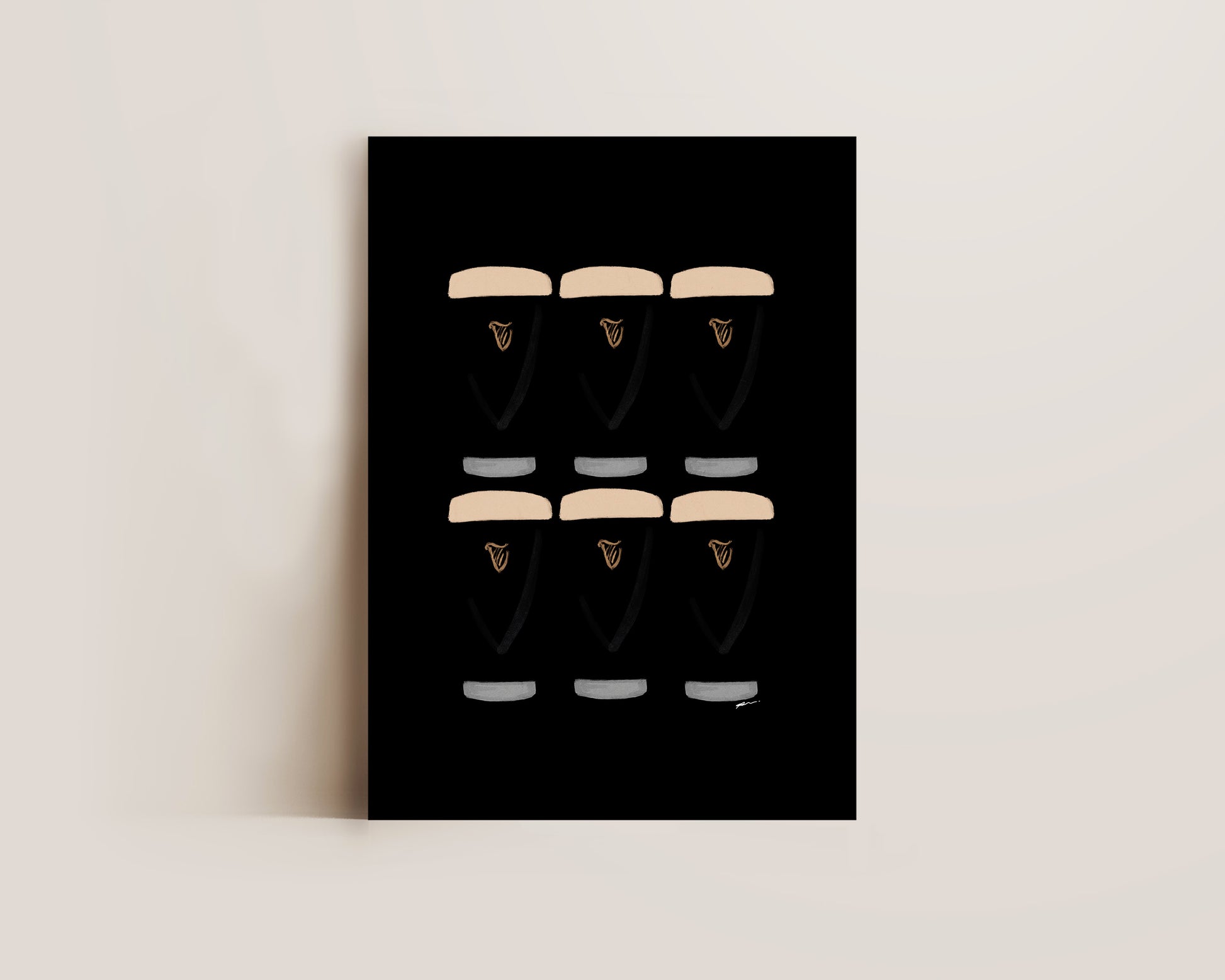 A kitchen print featuring six hand drawn pints of Guinness, set against a black background. The perfect modern kitchen print. Printed on archival matte 240gsm paper. Available in multiple sizes, with framed or unframed options. Exclusively designed by one of our artists at our studio.