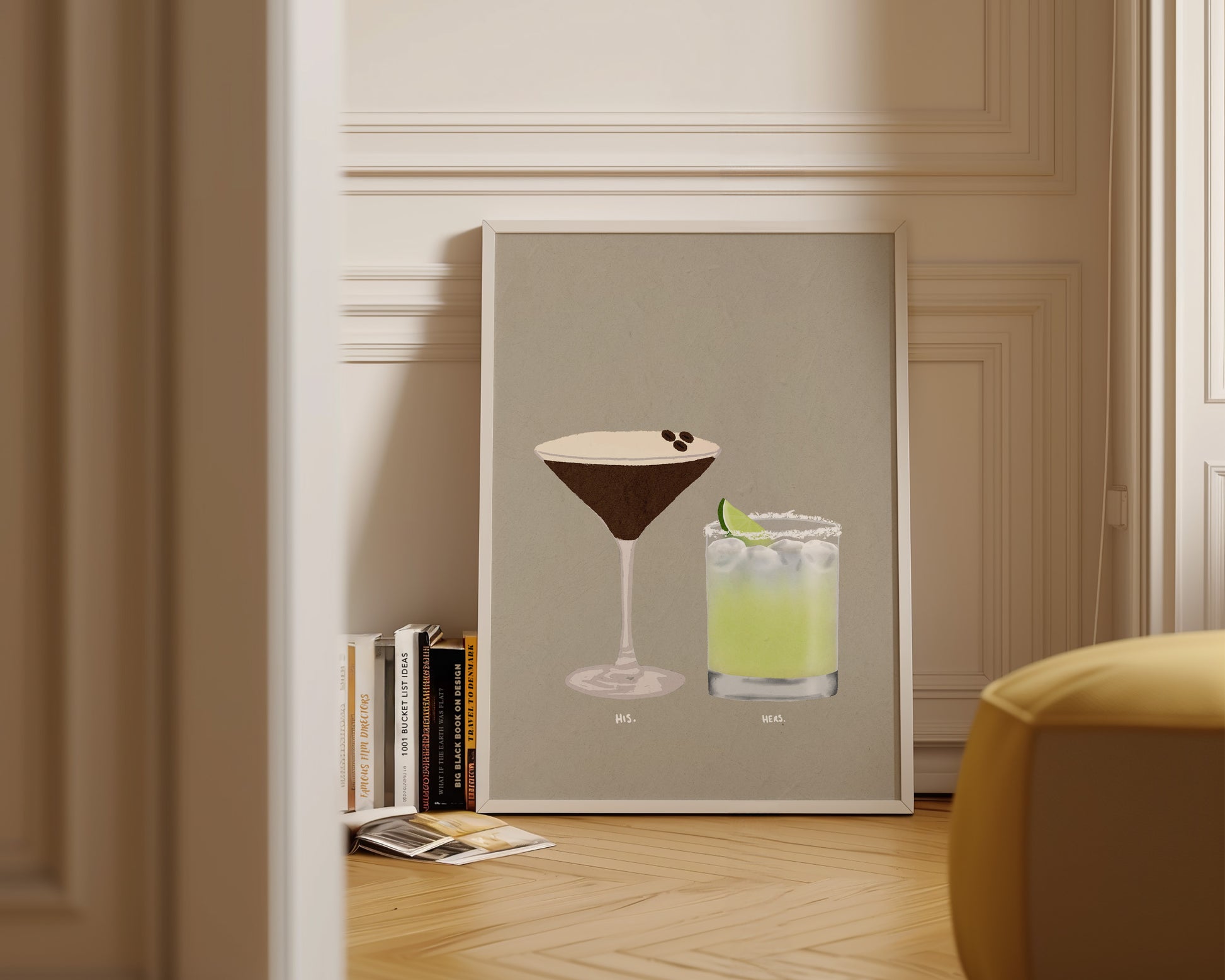 A cocktail print featuring hand drawn Espresso Martini alongside a Tommy's Marg cocktail, set against a pale green/grey background, the perfect modern kitchen print. Printed on archival matte 240gsm paper. Available in multiple sizes, with framed or unframed options. Exclusively designed by one of our artists at our studio.