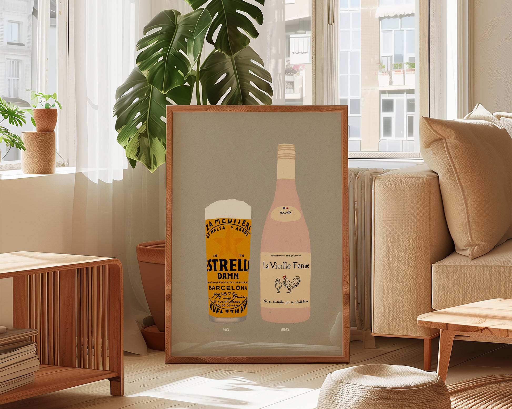 An Estrella & Chicken Wine print featuring hand drawn pint of Estrella alongside a bottle of Chicken Wine, set against a pale green/grey background, the perfect modern kitchen print. Printed on archival matte 240gsm paper. Available in multiple sizes, with framed or unframed options. Exclusively designed by one of our artists at our studio.