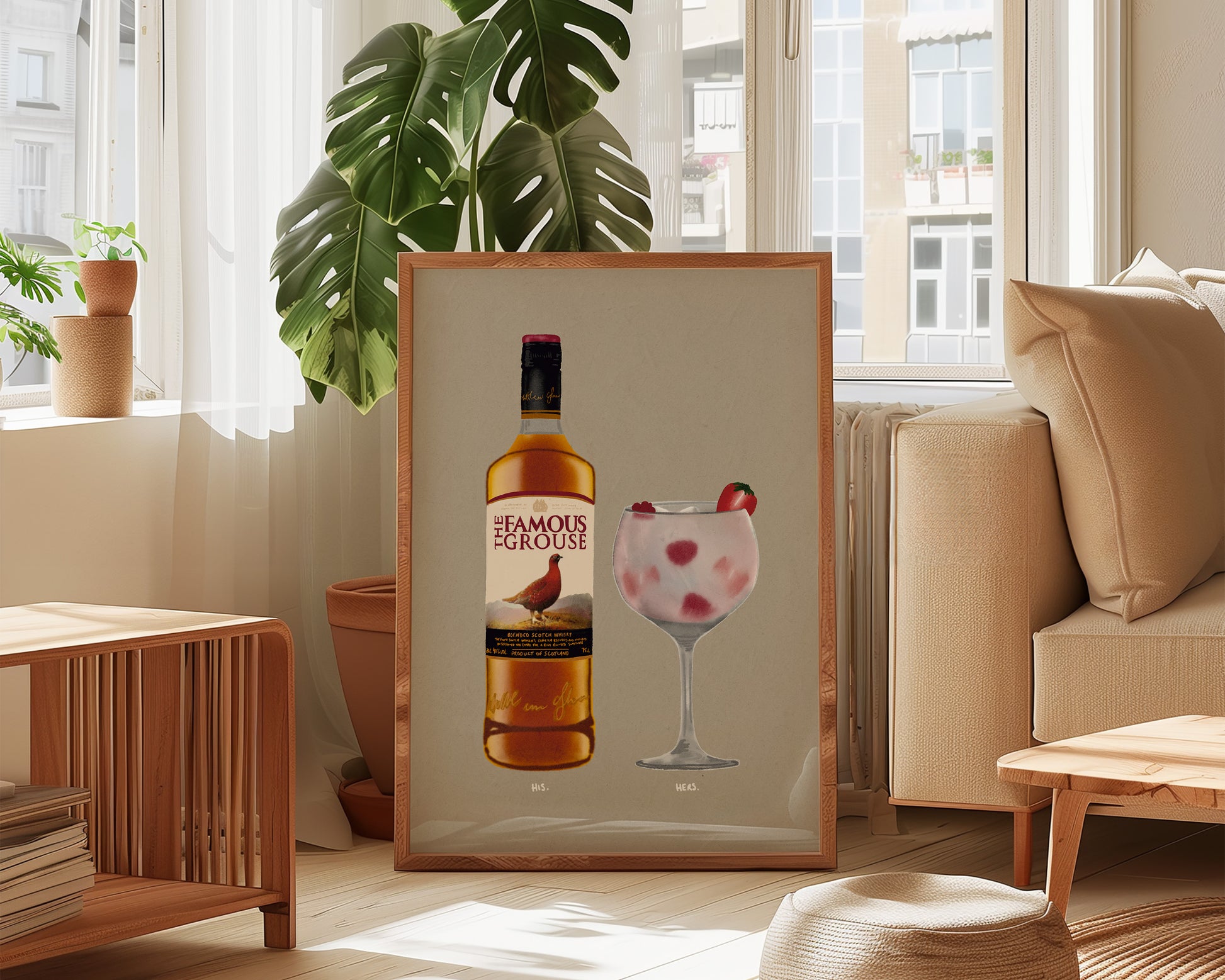A couples drink print featuring hand drawn bottle of Famous Grouse Whisky alongside a Pink Gin, set against a pale green/grey background, the perfect modern kitchen print. Printed on archival matte 240gsm paper. Available in multiple sizes, with framed or unframed options. Exclusively designed by one of our artists at our studio.