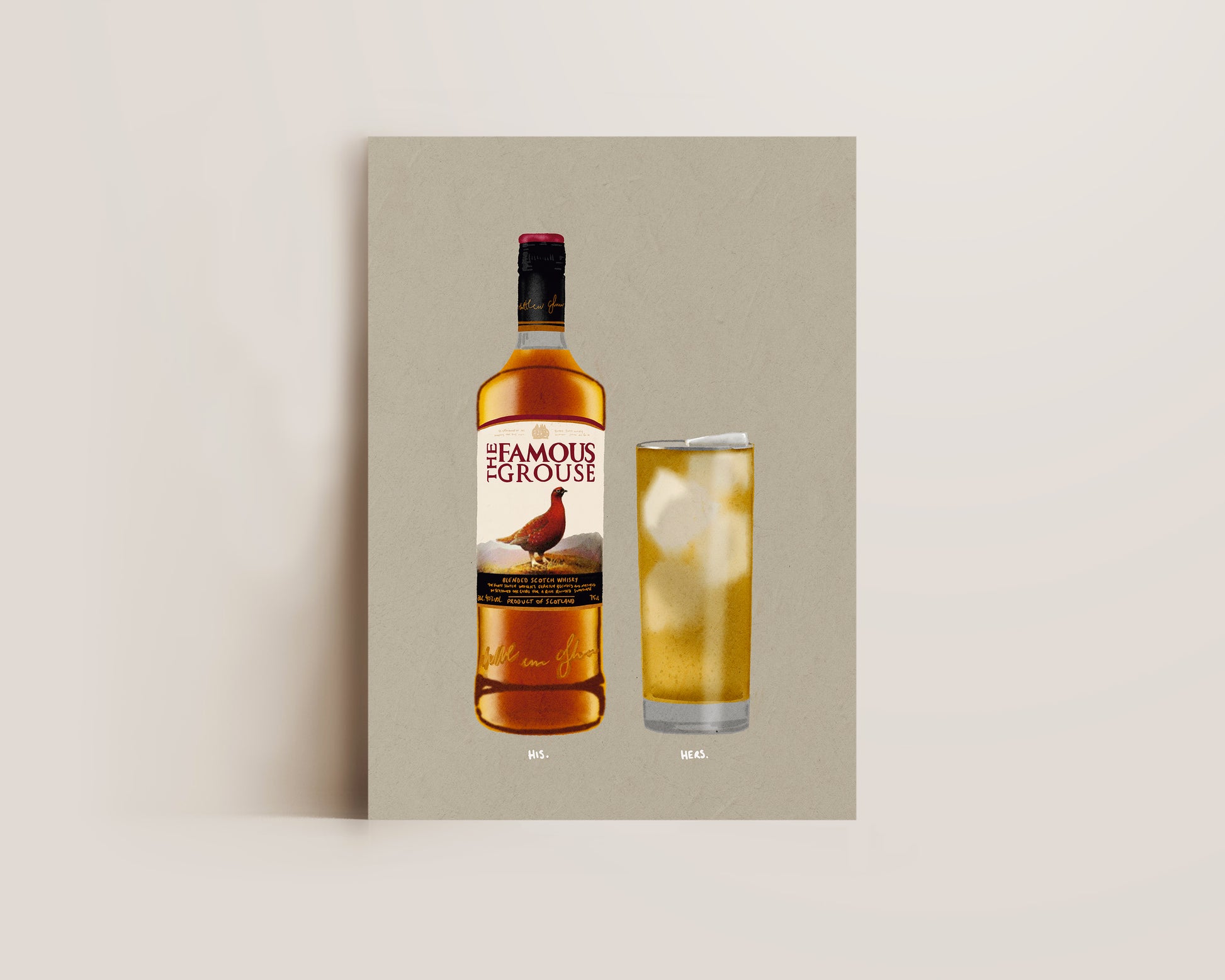 A couples drink print featuring hand drawn bottle of Famous Grouse Whisky alongside a Vodka Redbull, set against a pale green/grey background, the perfect modern kitchen print. Printed on archival matte 240gsm paper. Available in multiple sizes, with framed or unframed options. Exclusively designed by one of our artists at our studio.