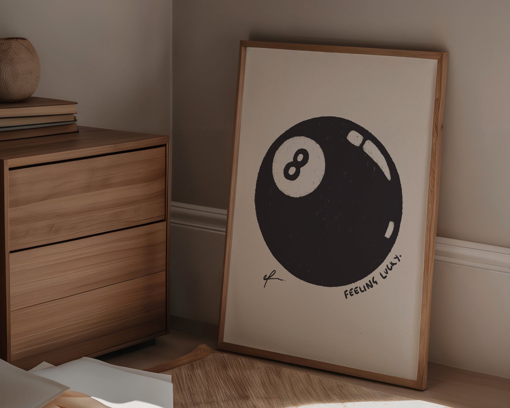 A cue ball bedroom print featuring a hand drawn oil pastel 8 ball with "Feeling Lucky" quote, against a neutral background. Printed on archival matte 240gsm paper. Available in multiple sizes, with framed or unframed options. Exclusively designed by one of our artists at our studio.
