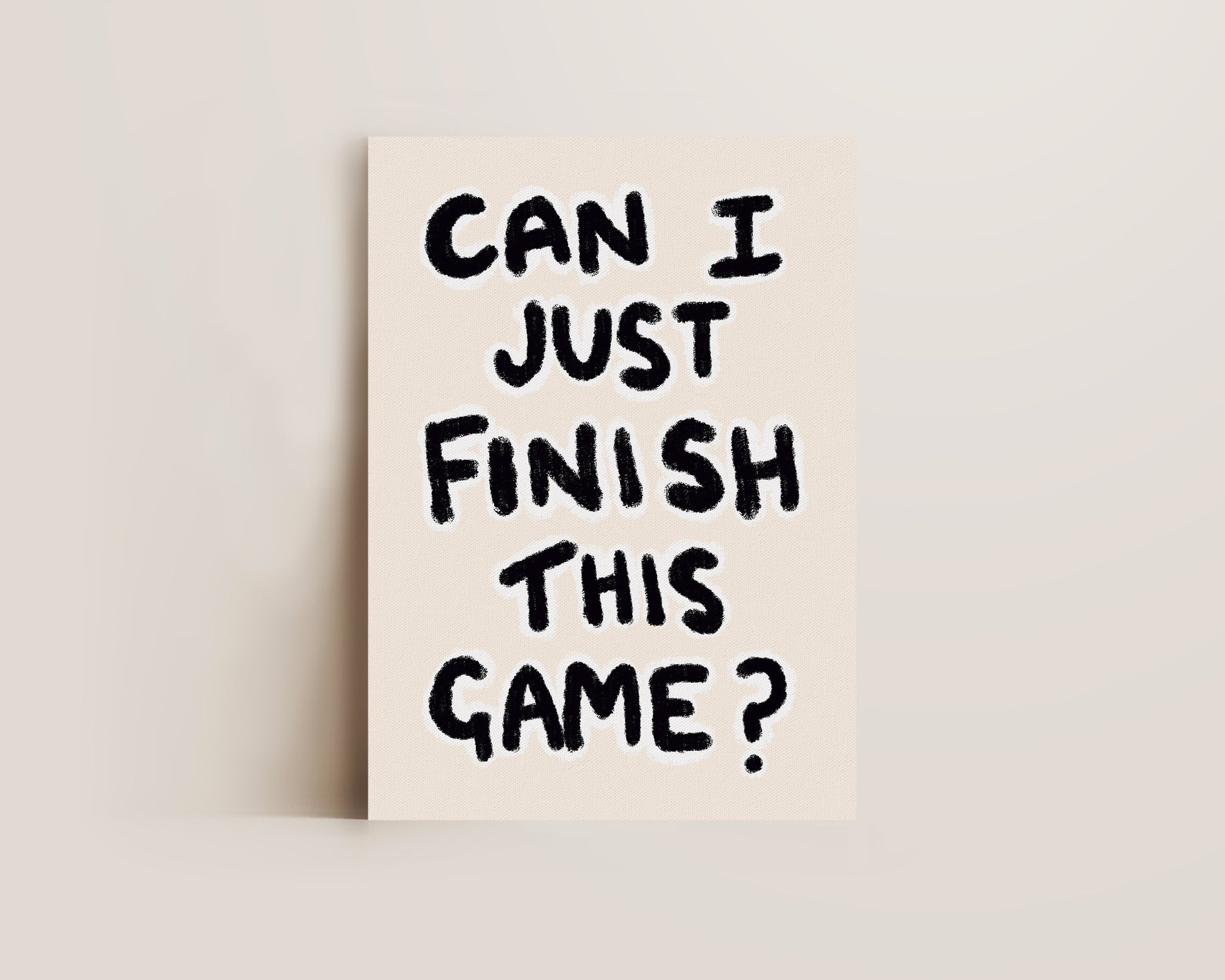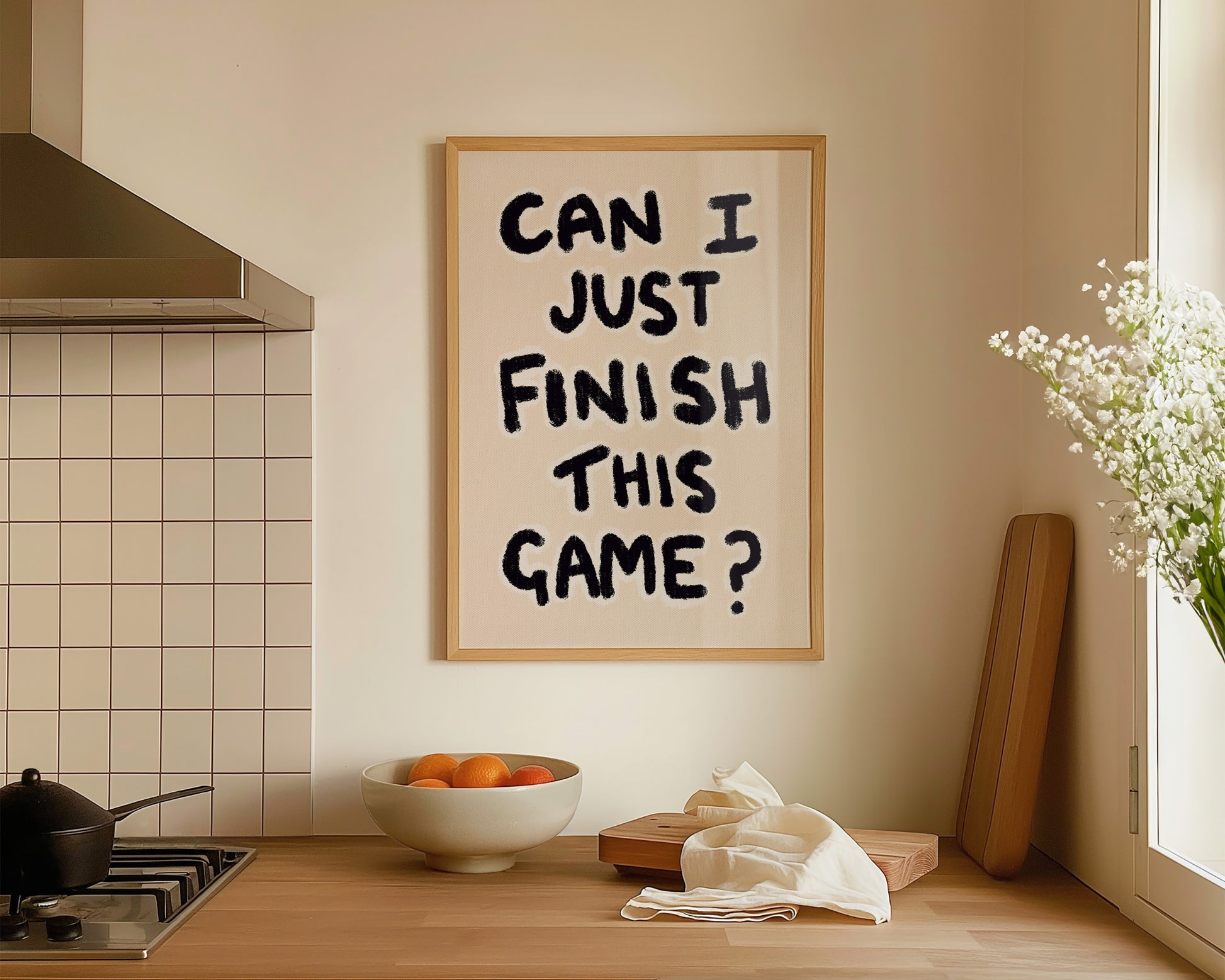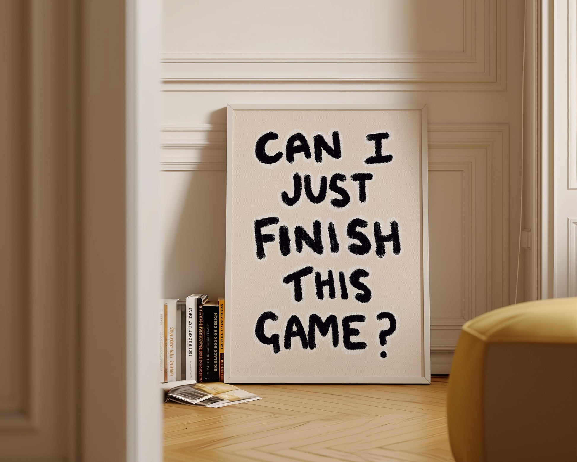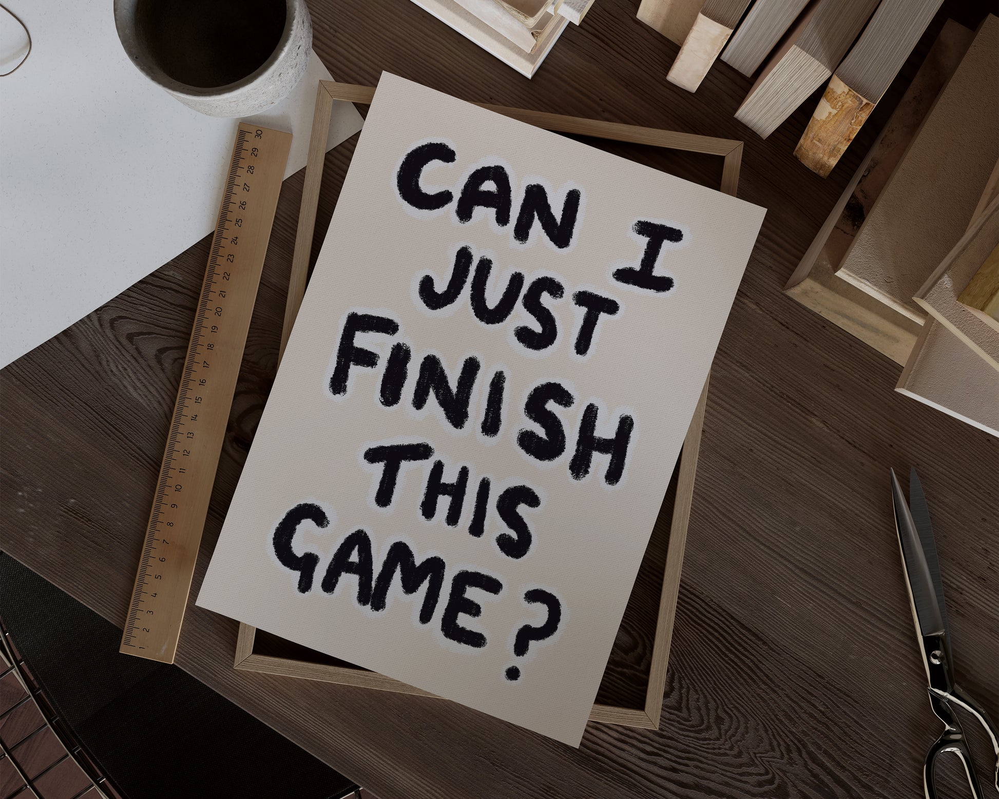 A gaming quote print featuring "Can I Just Finish This Game" in hand drawn oil pastel font, against a neutral beige background. Exclusively designed by one of our artists at our studio.