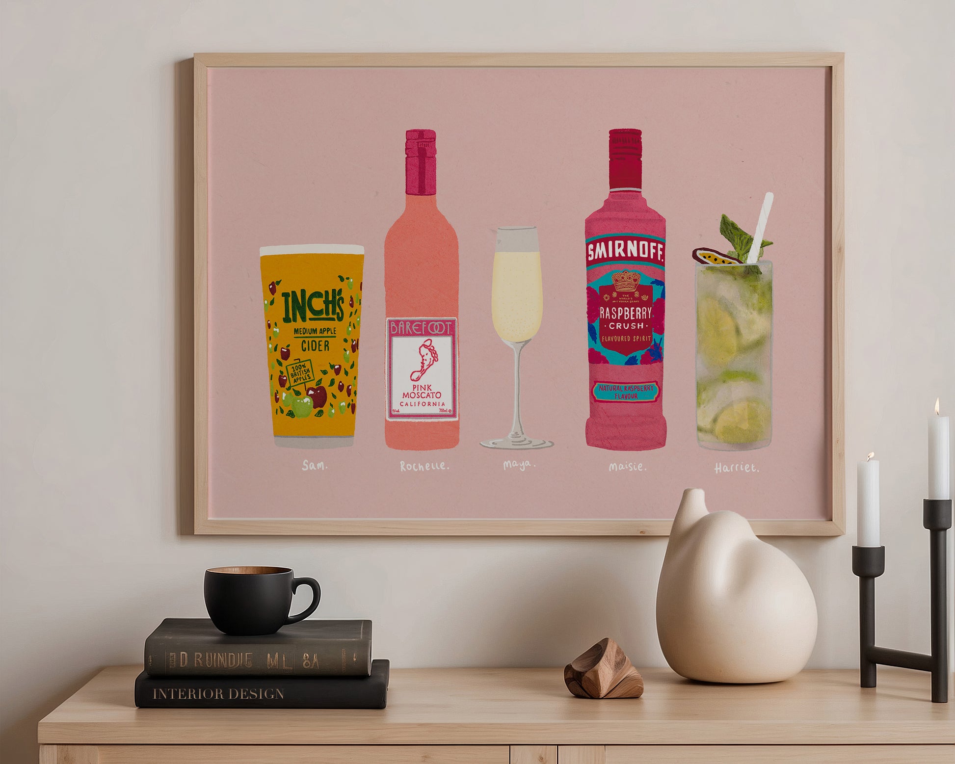 A flatmate drinks print featuring hand drawn drinks, perfect for a group of flatmates, set against a pale pink background, the perfect modern apartment print. Printed on archival matte 240gsm paper. Contact us for personalisation. Available in multiple sizes, with framed or unframed options. Exclusively designed by one of our artists at our studio.