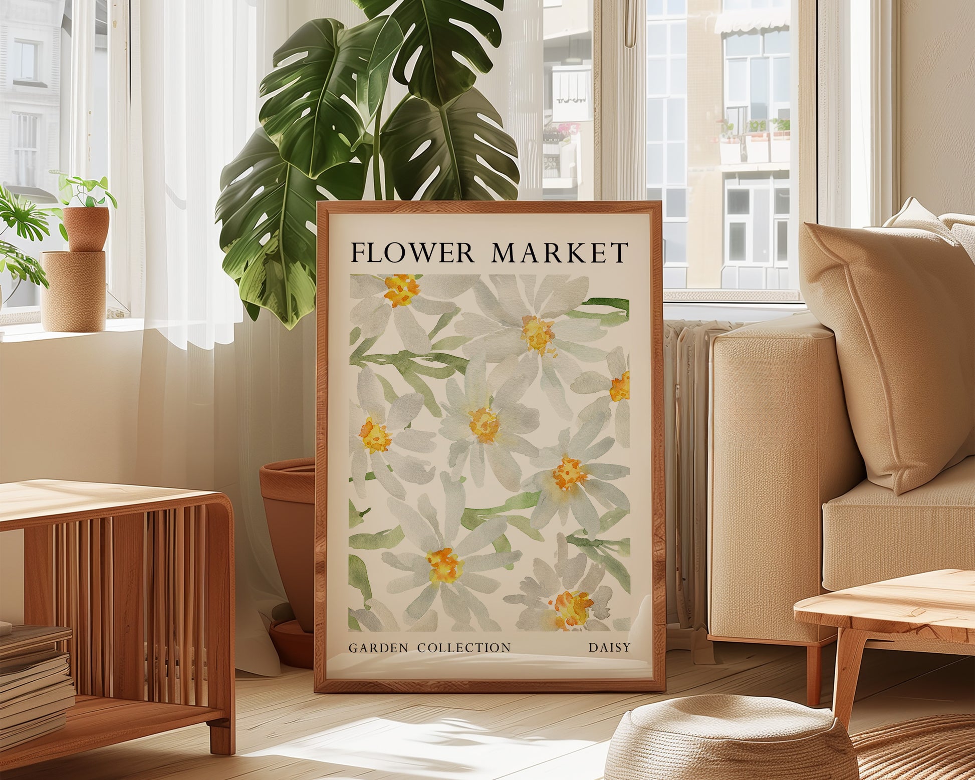 A botanical art print featuring a colourful hand drawn daisy pattern in an exhibition poster style layout. Exclusively designed by one of our artists at our studio.