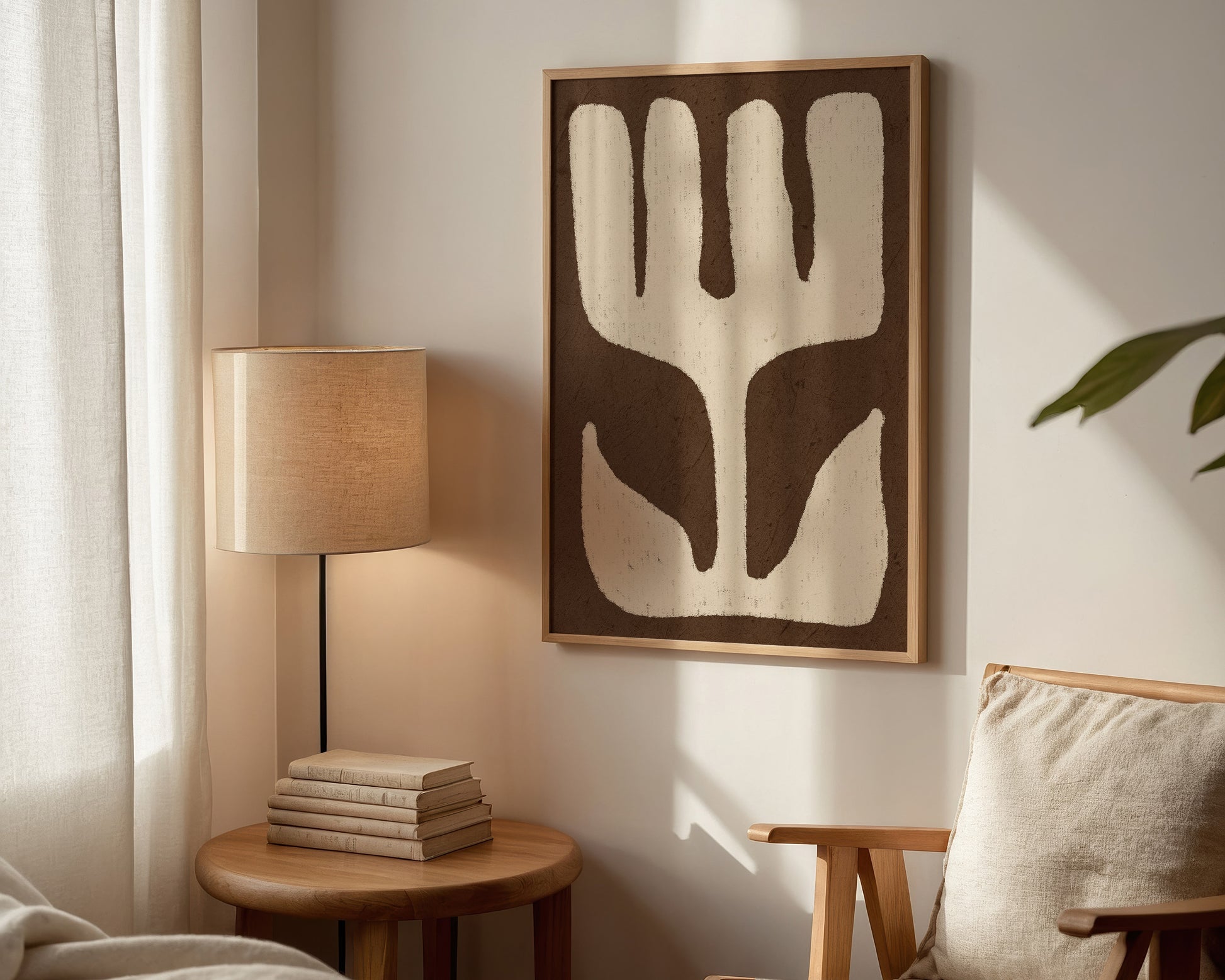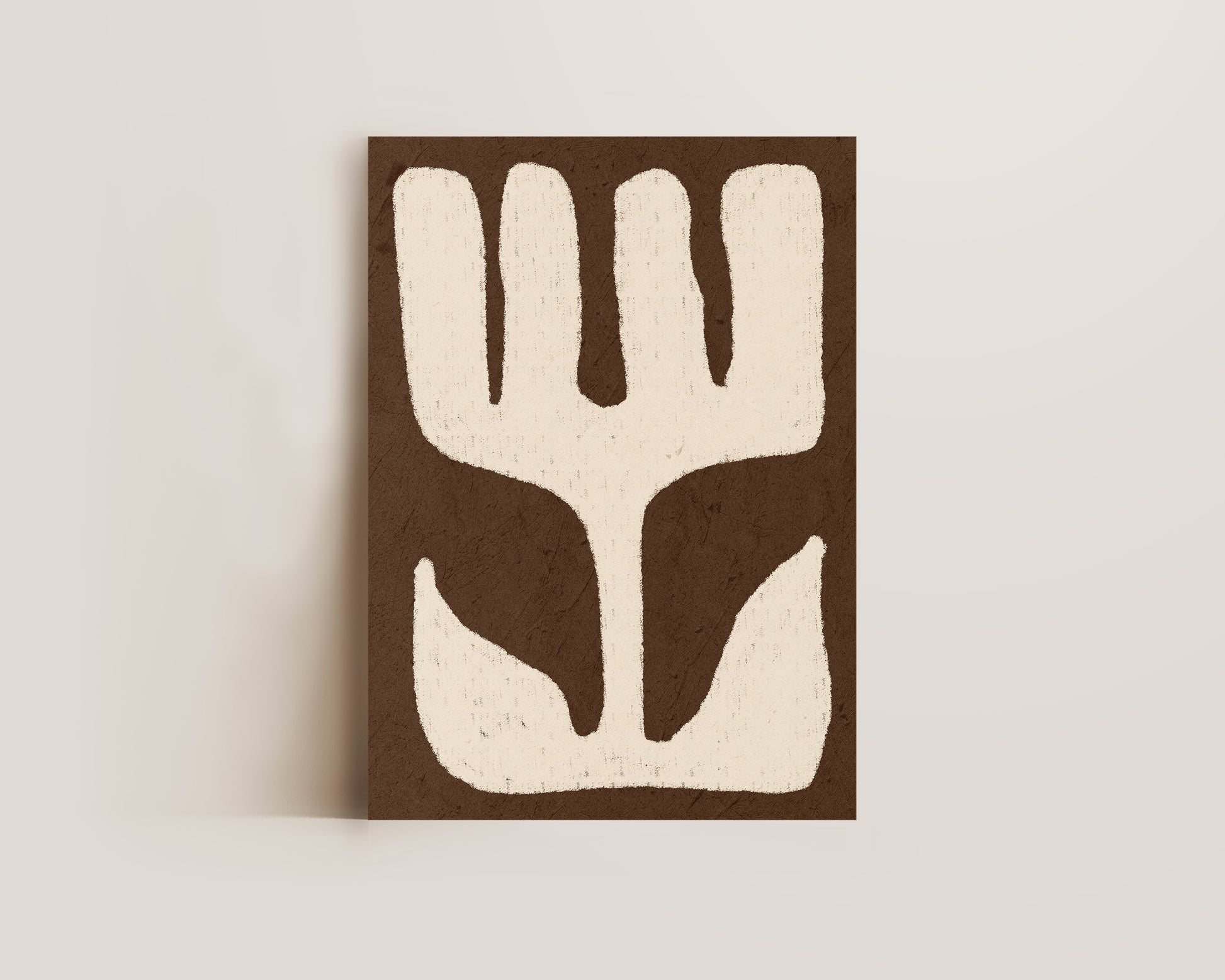 A hand drawn oil pastel print featuring abstract cream flower on a brown background. Exclusively hand drawn by one of our artists at our studio.