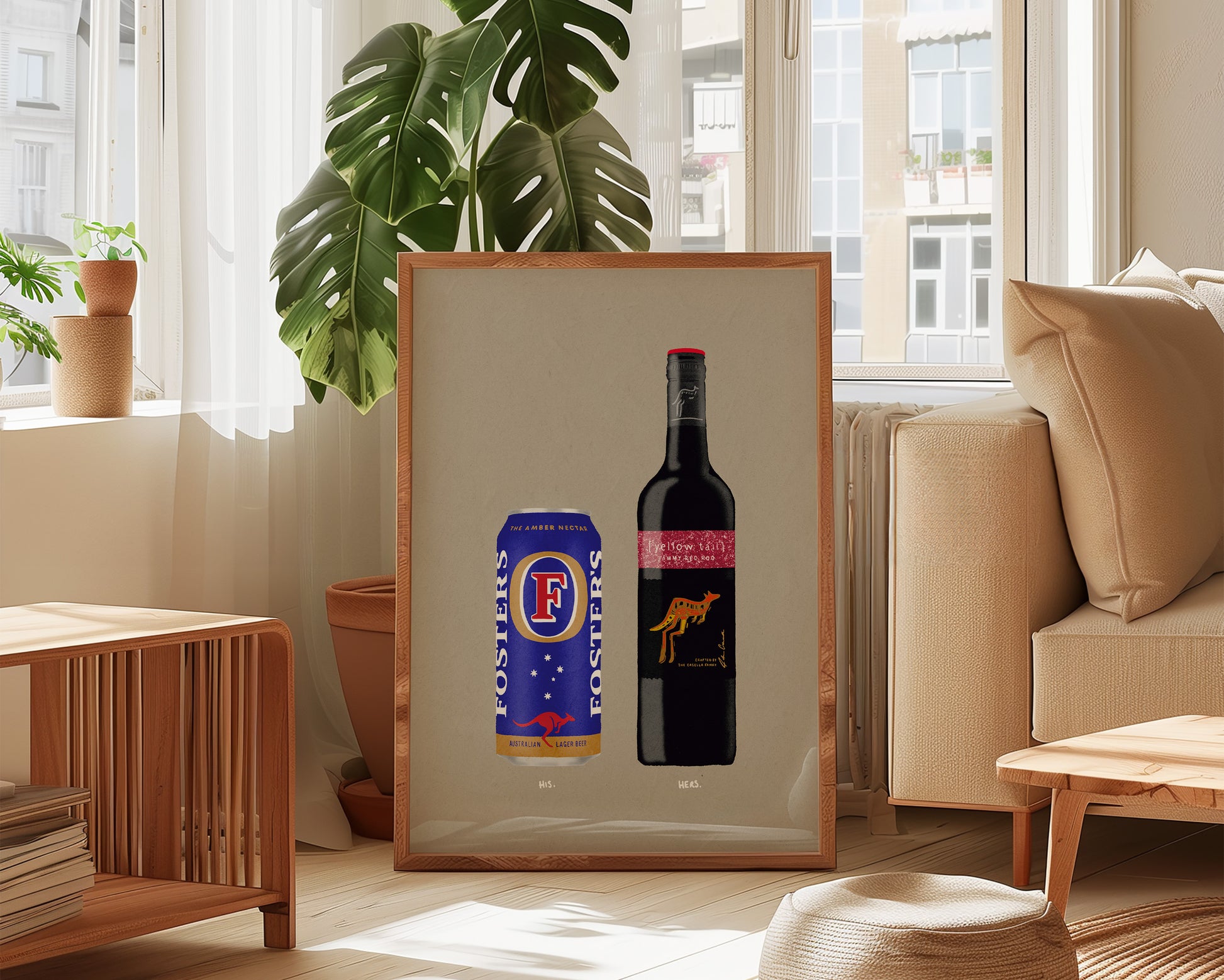 A couples drink print featuring hand drawn can of Fosters alongside a bottle of Yellow Tail Jammy Red Roo, set against a pale green/grey background, the perfect modern kitchen print. Printed on archival matte 240gsm paper. Available in multiple sizes, with framed or unframed options. Exclusively designed by one of our artists at our studio.