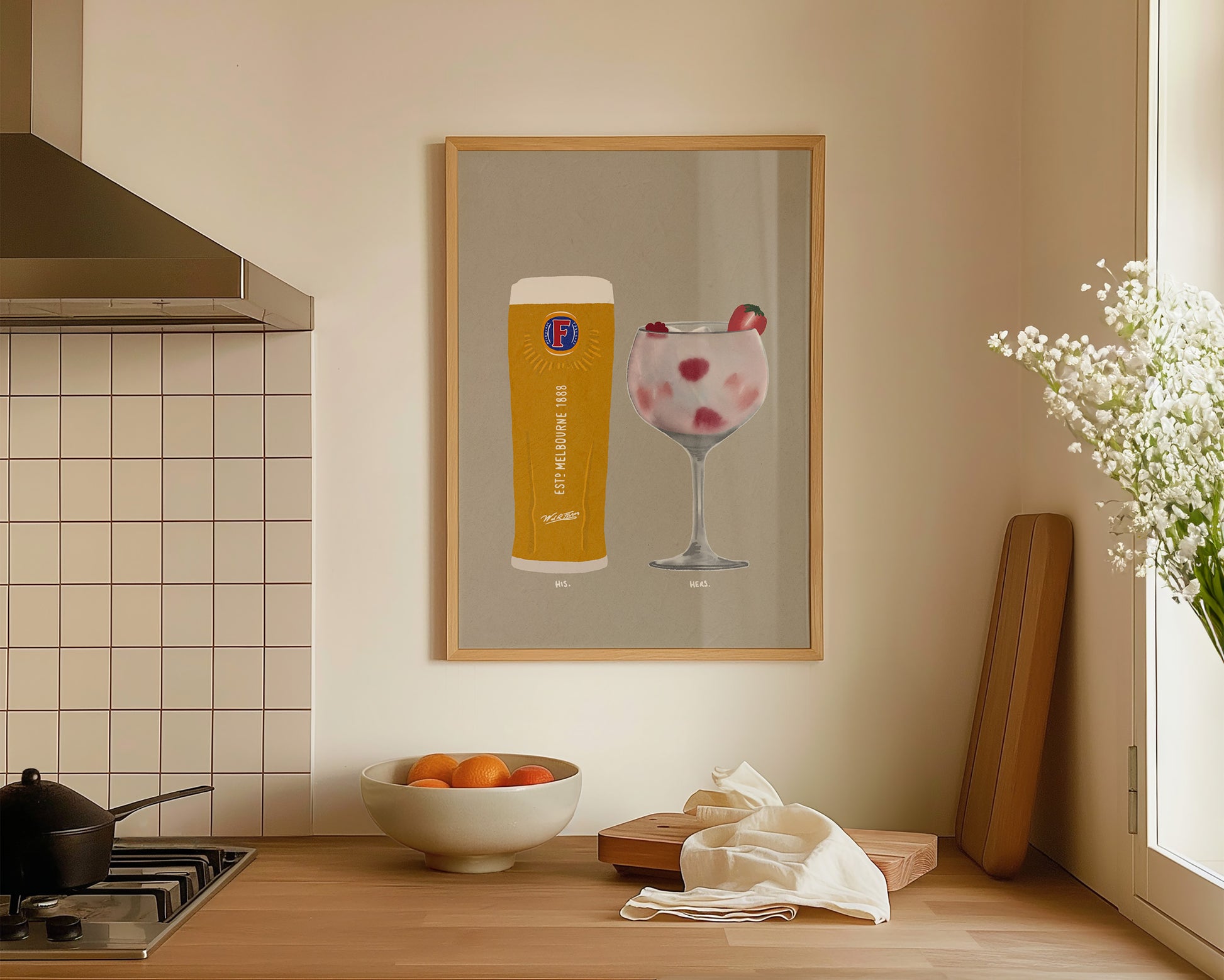 A Fosters and Pink Gin print featuring hand drawn pint of Fosters alongside a glass of Pink Gin, set against a pale green/grey background, the perfect modern kitchen print. Printed on archival matte 240gsm paper. Available in multiple sizes, with framed or unframed options. Exclusively designed by one of our artists at our studio.