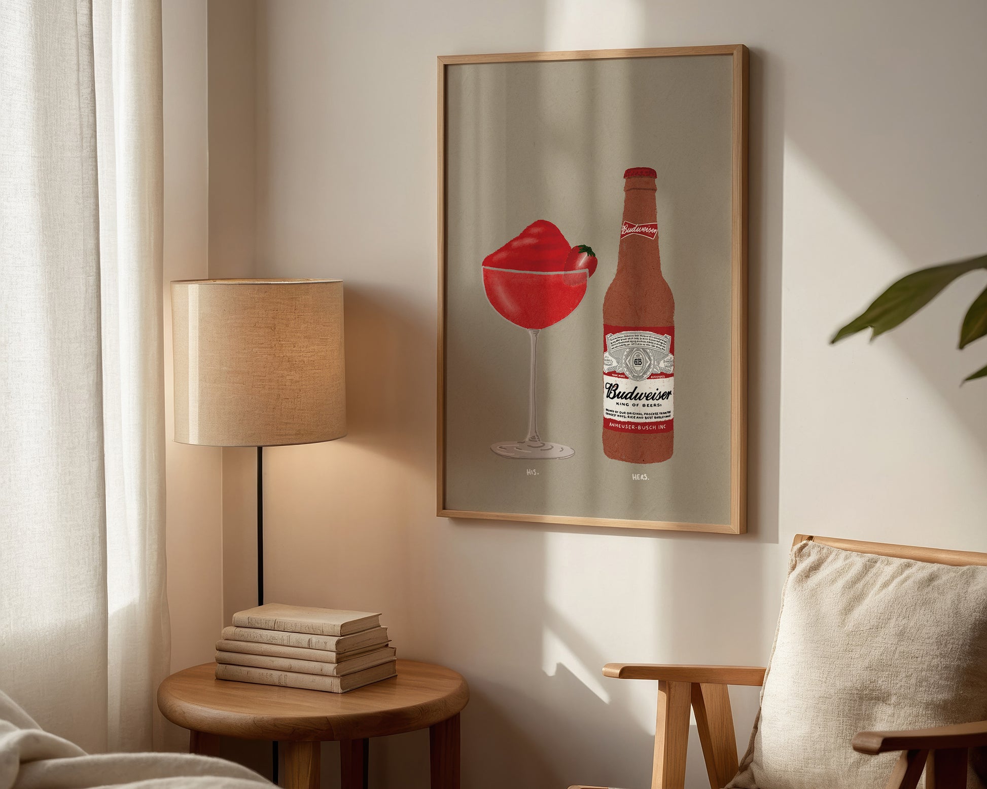 A couples drinks print featuring hand drawn Frozen Strawberry Daiquiri cocktail alongside a bottle of Budweiser, set against a pale green/grey background, the perfect modern kitchen print. Printed on archival matte 240gsm paper. Available in multiple sizes, with framed or unframed options. Exclusively designed by one of our artists at our studio.