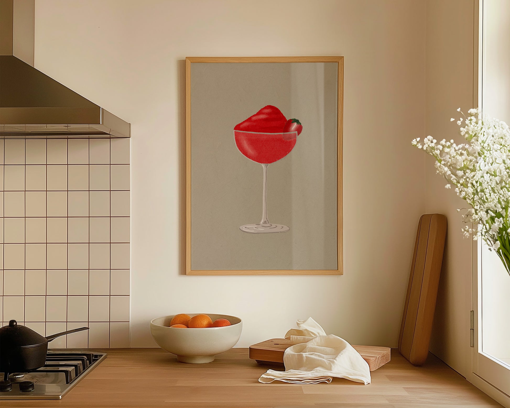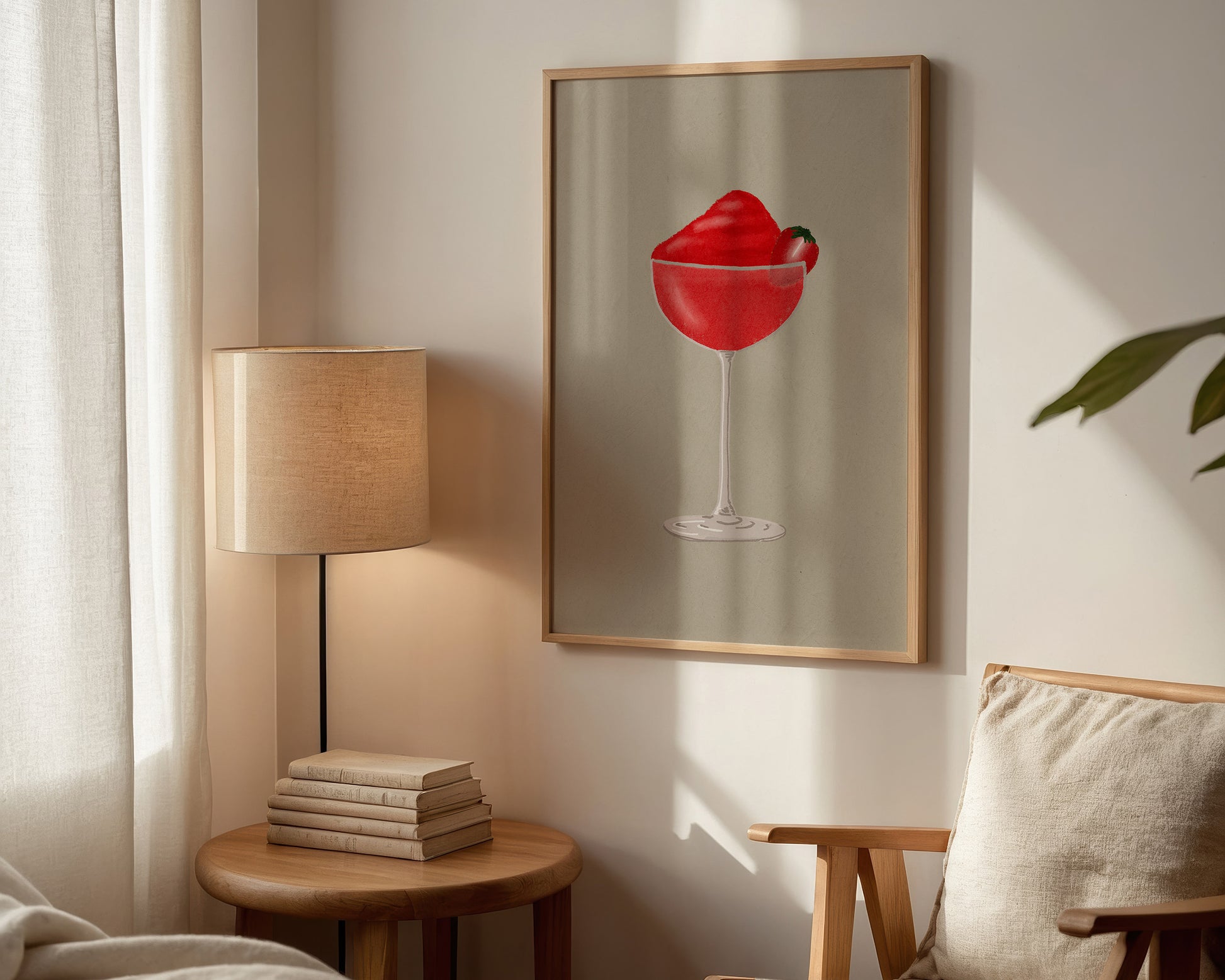 A cocktail print featuring a hand drawn Frozen Strawberry Daiquiri cocktail, set against a pale green/grey background, the perfect modern kitchen print. Printed on archival matte 240gsm paper. Available in multiple sizes, with framed or unframed options. Exclusively designed by one of our artists at our studio.