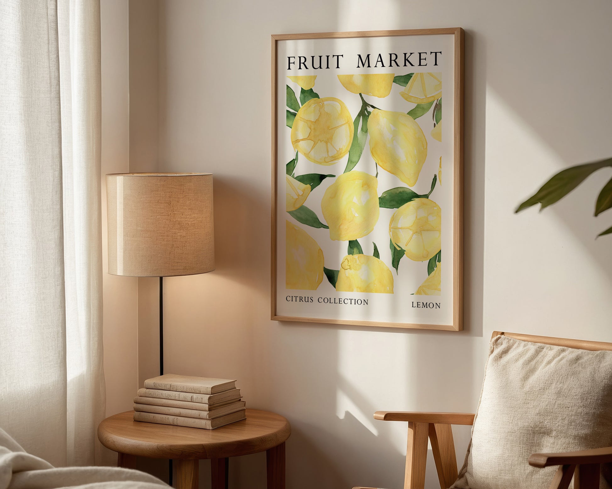 A lemon art print featuring colourful hand drawn lemons, in an exhibition style layout. Exclusively designed by one of our artists at our studio.