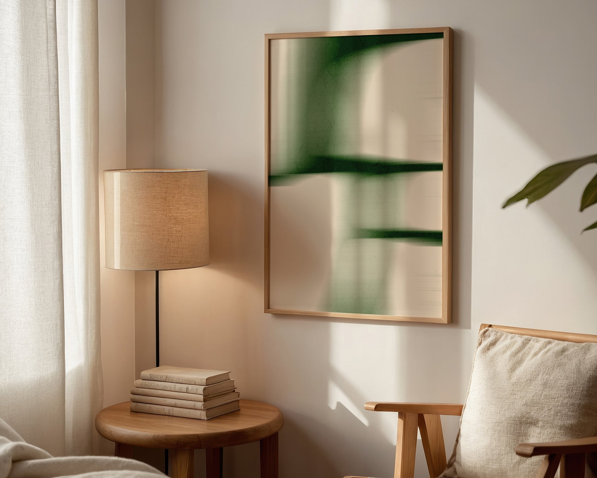 An abstract print featuring an off white, punctuated by a blur of deep green. The perfect statement piece. Printed on archival matte 240gsm paper. Available in multiple sizes, with framed or unframed options. Exclusively designed by one of our artists at our studio.