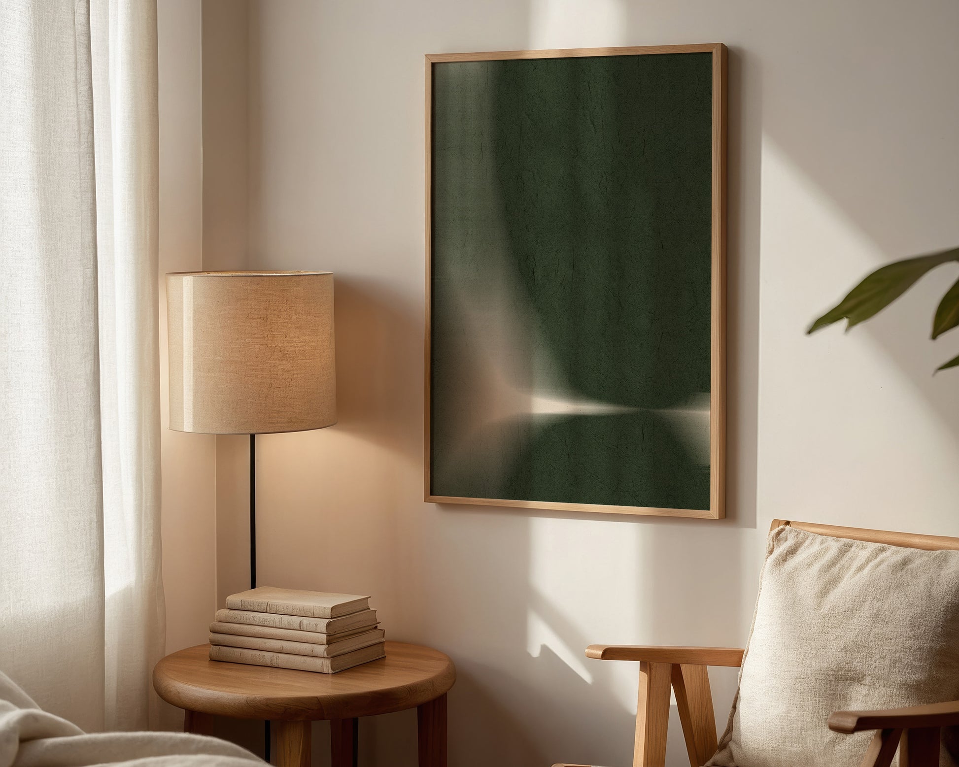 An abstract print featuring a blur of deep green punctuated by pale tones. The perfect statement piece. Printed on archival matte 240gsm paper. Available in multiple sizes, with framed or unframed options. Exclusively designed by one of our artists at our studio.