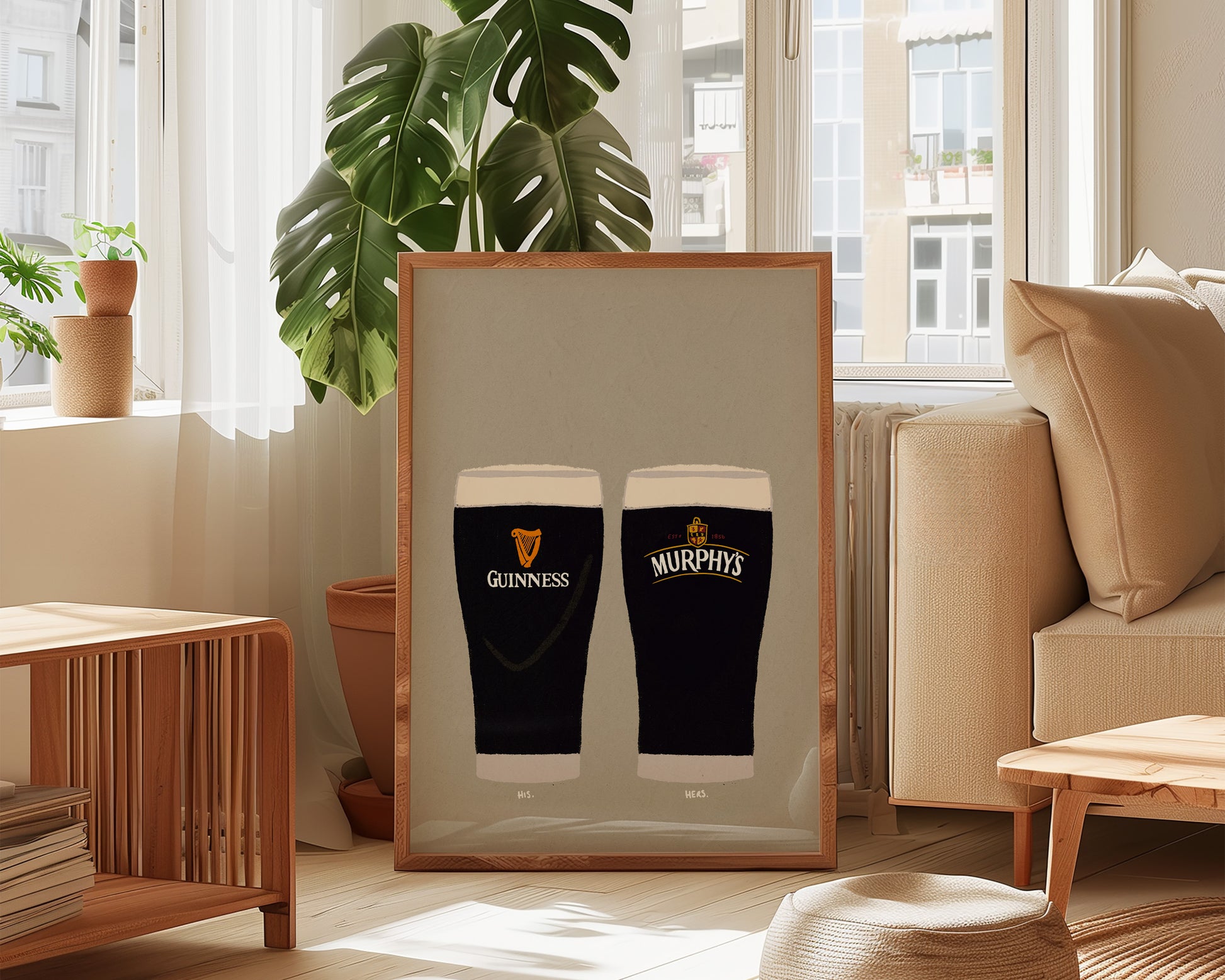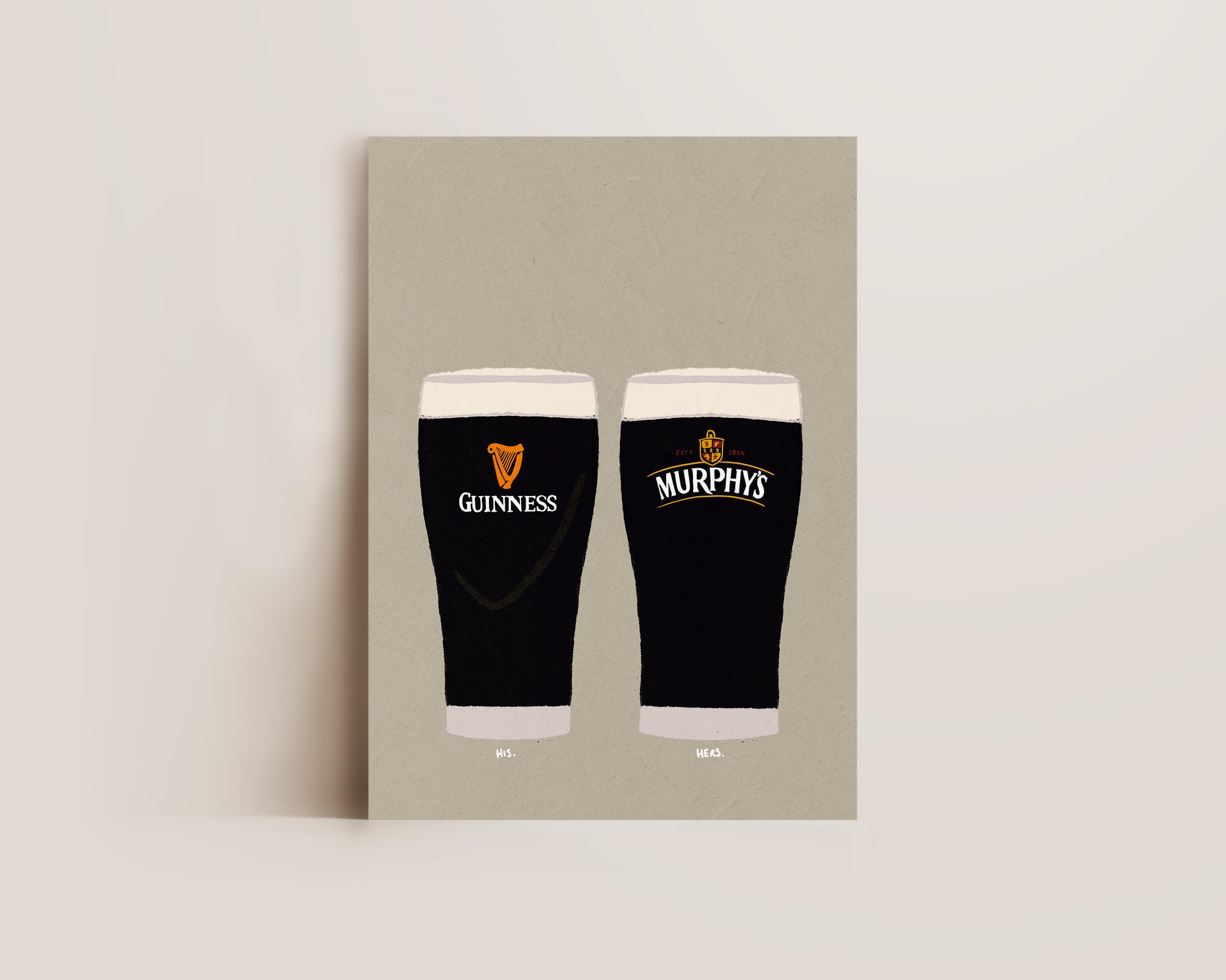 A Guinness and Murphys print featuring hand drawn pint of Guinness alongside a pint of Murphys, set against a pale green/grey background, the perfect modern kitchen print. Printed on archival matte 240gsm paper. Available in multiple sizes, with framed or unframed options. Exclusively designed by one of our artists at our studio.