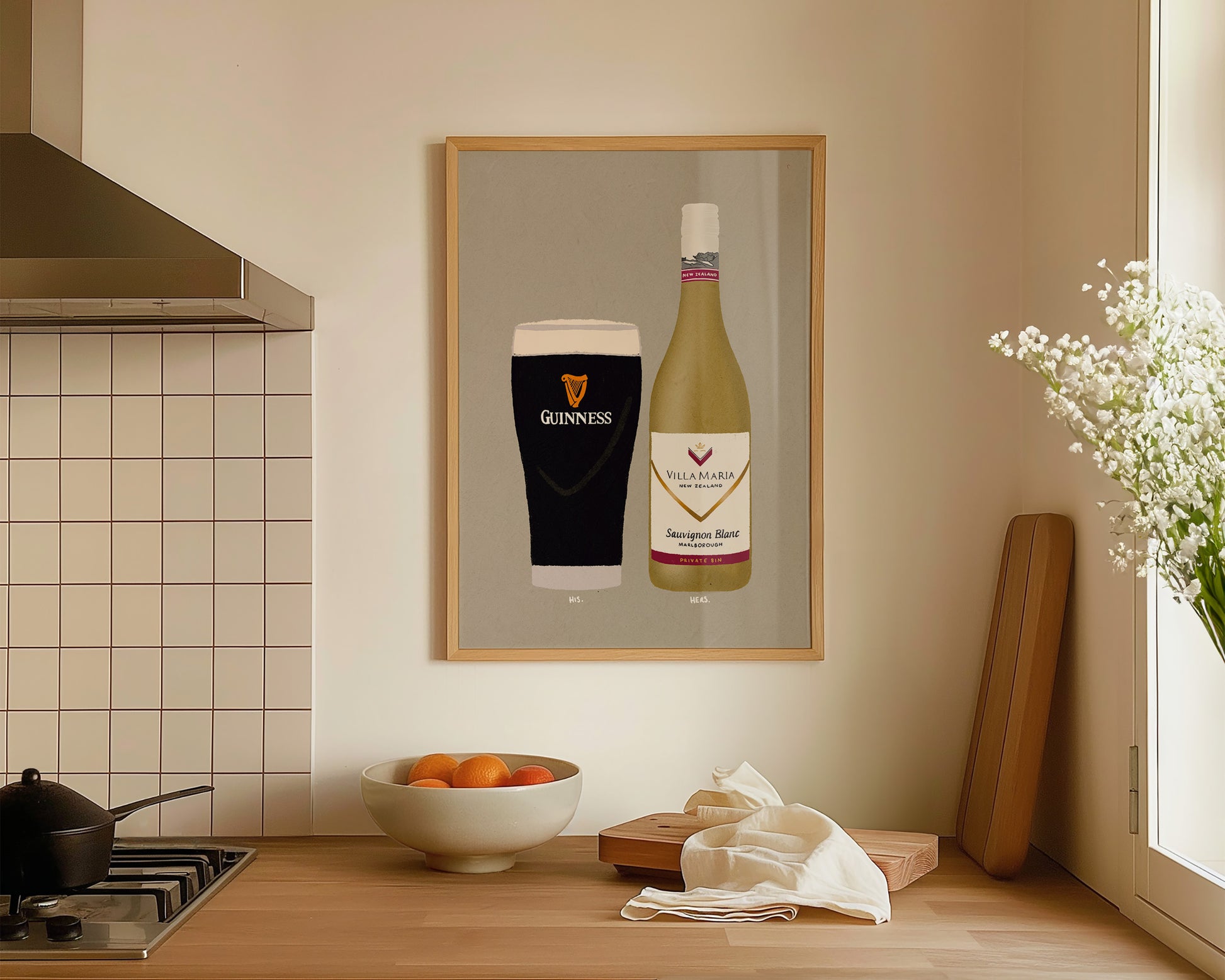 A Guinness and wine print featuring hand drawn pint of Guinness alongside a bottle of Villa Maria Sauvignon Blanc wine, set against a pale green/grey background, the perfect modern kitchen print. Printed on archival matte 240gsm paper. Available in multiple sizes, with framed or unframed options. Exclusively designed by one of our artists at our studio.