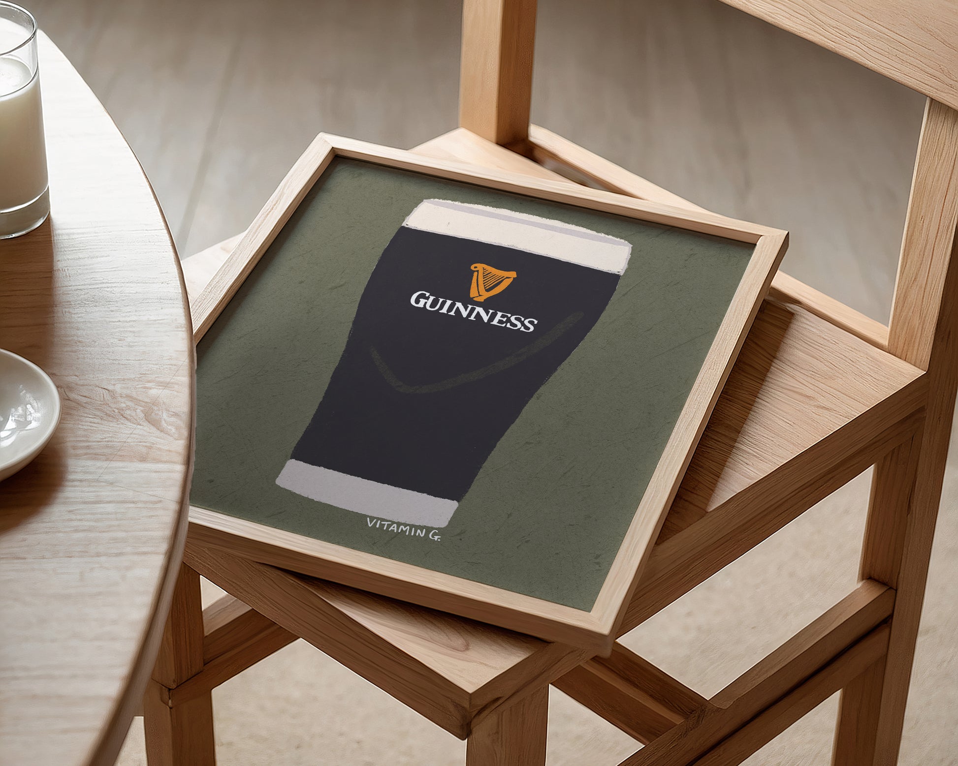 A Guinness print featuring hand drawn pint of Guinness with Vitamin G slogan. Featuring a green background as a subtle nod to its proud Irish heritage. Printed on archival matte 240gsm paper. Available in multiple sizes, with framed or unframed options. Exclusively designed by one of our artists at our studio.