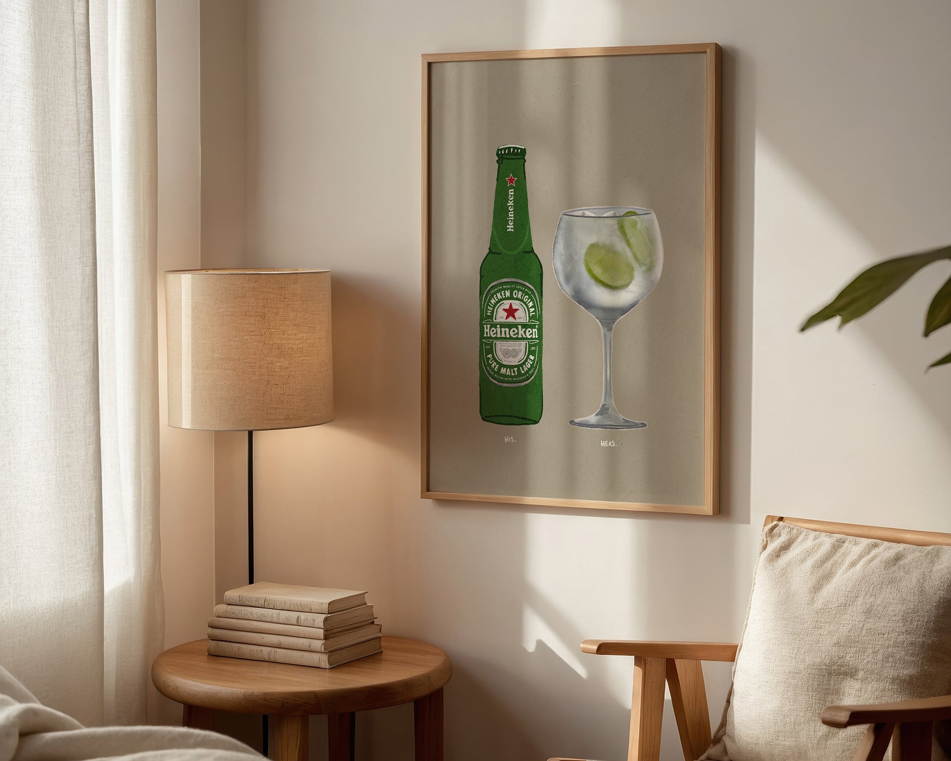A Heineken and Gin & Tonic print featuring hand drawn bottle of Heineken alongside a Gin & Tonic, set against a pale green/grey background, the perfect modern kitchen print. Printed on archival matte 240gsm paper. Available in multiple sizes, with framed or unframed options. Exclusively designed by one of our artists at our studio.