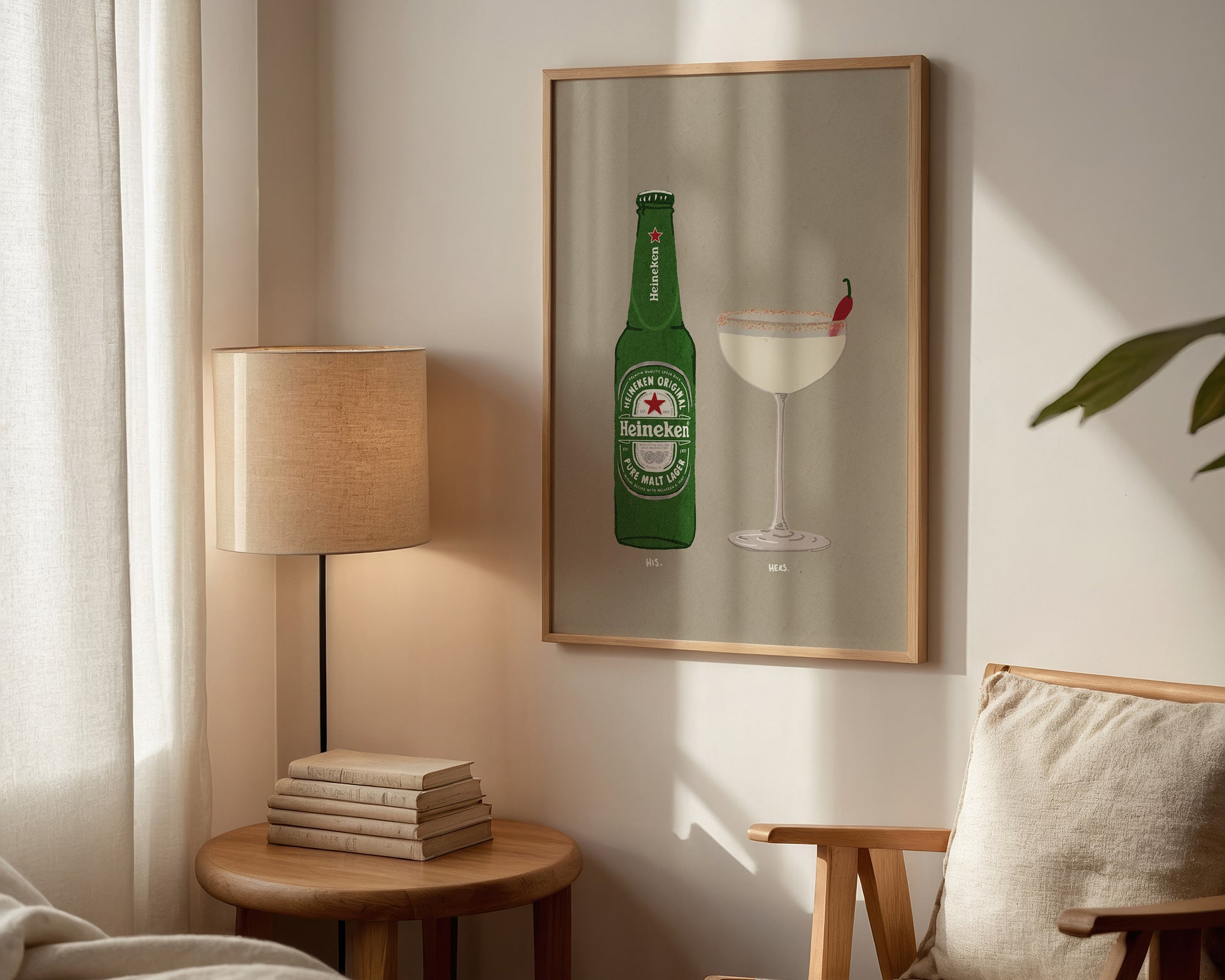 A Heineken & Spicy Marg print featuring hand drawn bottle of Heineken alongside a Spicy Marg cocktail, set against a pale green/grey background, the perfect modern kitchen print. Printed on archival matte 240gsm paper. Available in multiple sizes, with framed or unframed options. Exclusively designed by one of our artists at our studio.