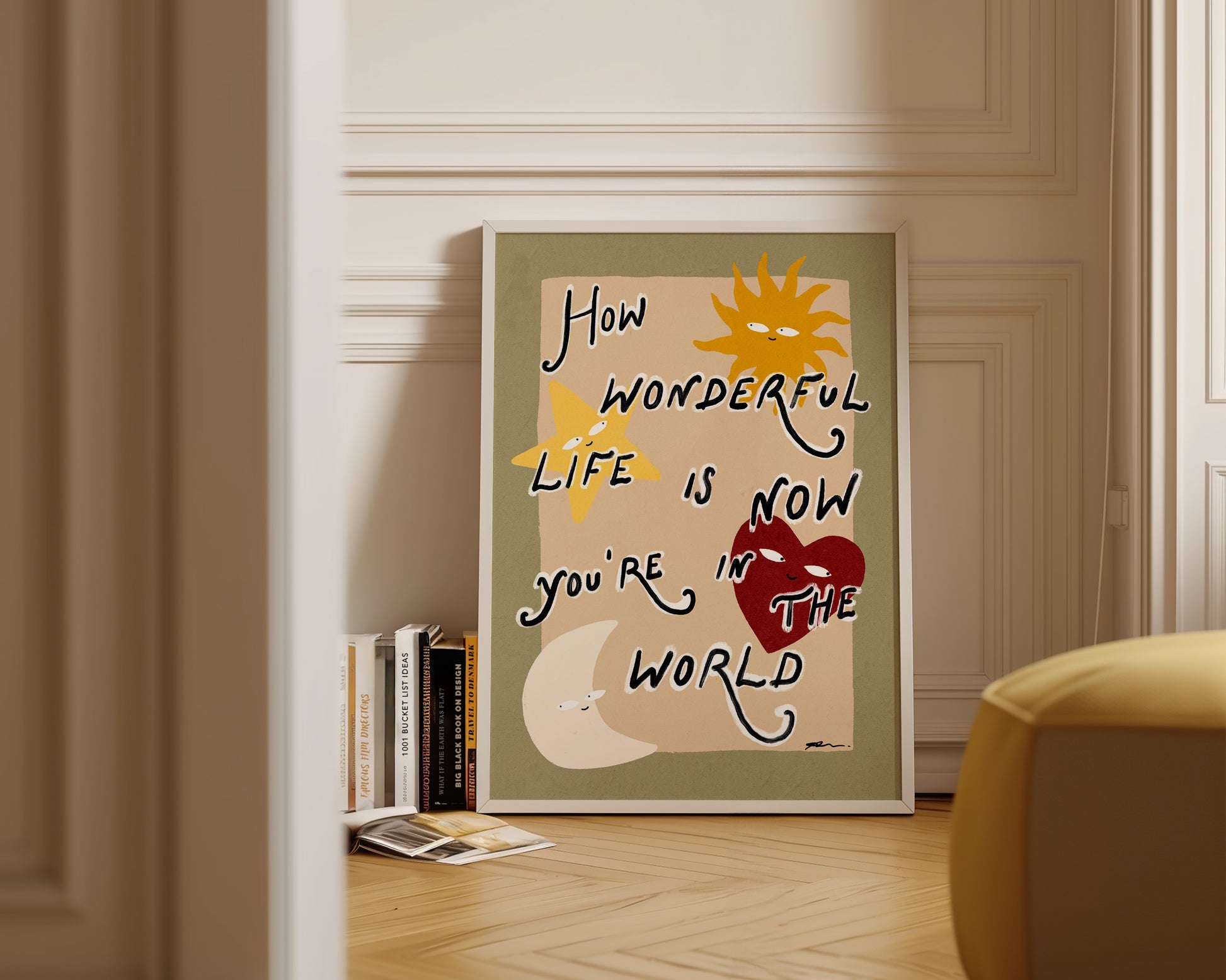 A nursery print featuring hand drawn sun, star, heart and moon, and "How wonderful life is now you're in the world" quote, set against a beige and green background. The perfect statement nursery wall decor. Printed on archival matte 240gsm paper. Available in multiple sizes, with framed or unframed options. Exclusively designed by one of our artists at our studio.