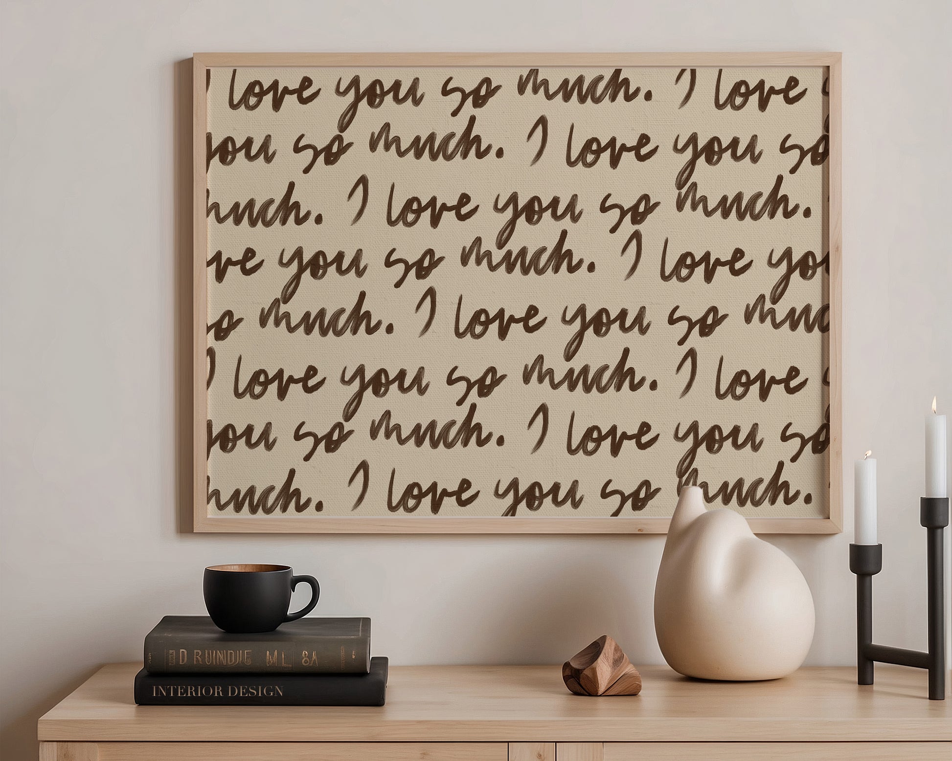 A horizontal bedroom print featuring "I Love You So Much" quote in brown, against a beige background. The perfect above bed print. Printed on archival matte 240gsm paper. Available in multiple sizes, with framed or unframed options. Exclusively designed by one of our artists at our studio.