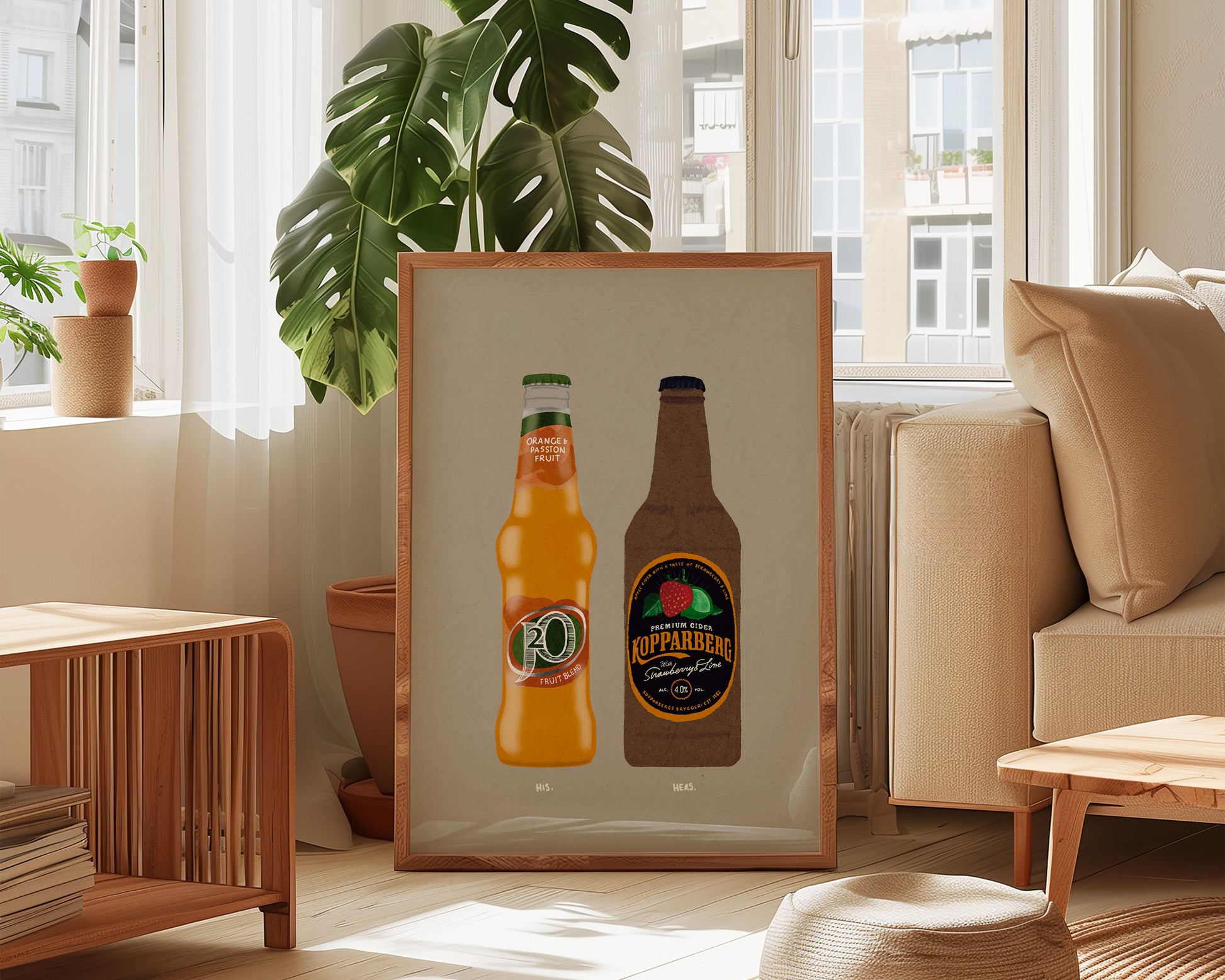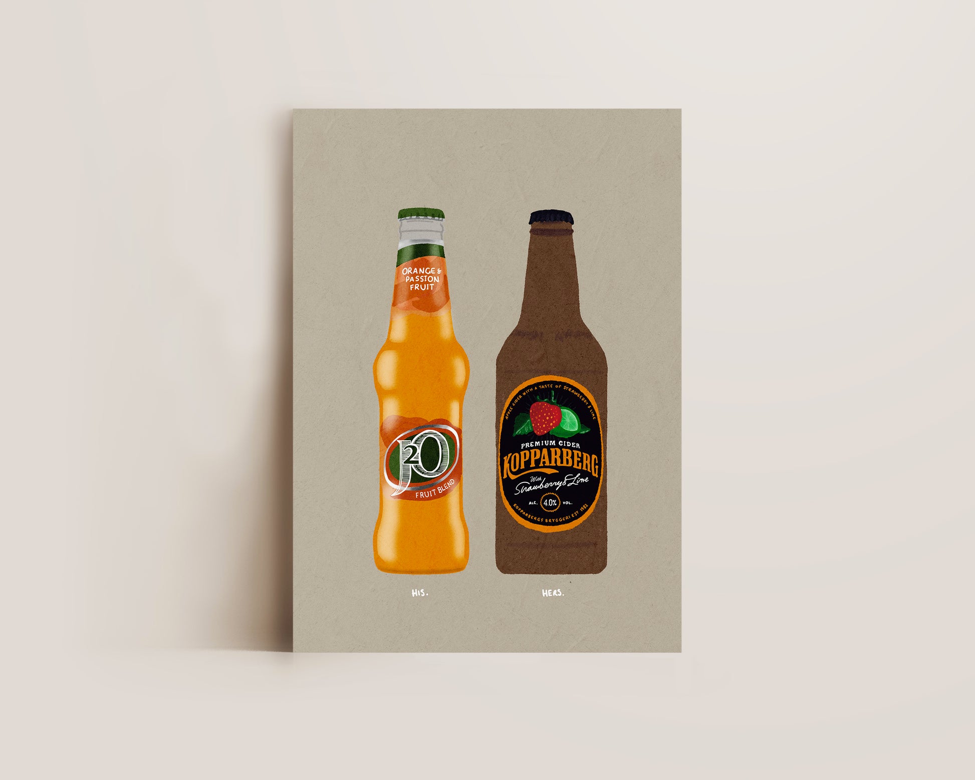 A couples drinks print featuring hand drawn bottle of J20 orange alongside a bottle of Strawberry Lime Kopparberg, set against a pale green/grey background, the perfect modern kitchen print. Printed on archival matte 240gsm paper. Available in multiple sizes, with framed or unframed options. Exclusively designed by one of our artists at our studio.