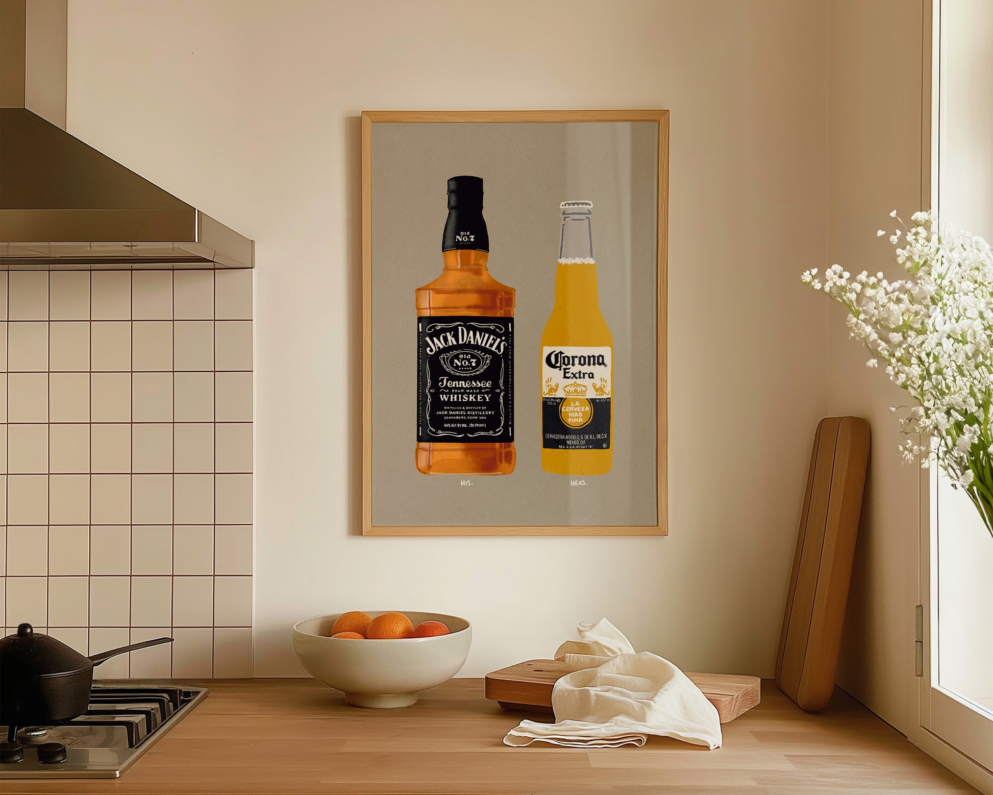 A Jack Daniel's and Corona print featuring hand drawn bottle of Jack Daniel's alongside a bottle of Corona, set against a pale green/grey background, the perfect modern kitchen print. Printed on archival matte 240gsm paper. Available in multiple sizes, with framed or unframed options. Exclusively designed by one of our artists at our studio.