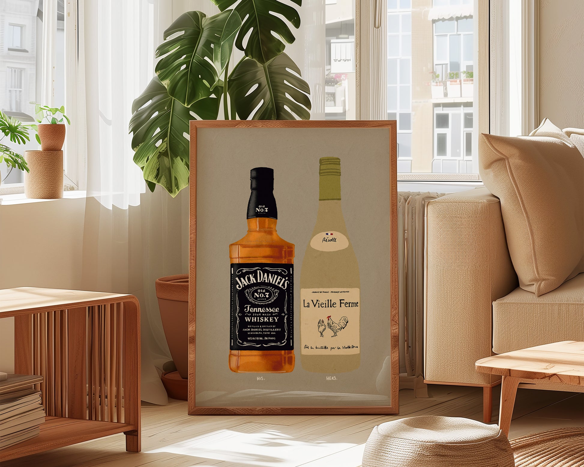 A Jack Daniel's whisky & wine print featuring hand drawn bottle of Jack Daniel's alongside a bottle of White Chicken Wine, set against a pale green/grey background, the perfect modern kitchen print. Printed on archival matte 240gsm paper. Available in multiple sizes, with framed or unframed options. Exclusively designed by one of our artists at our studio.
