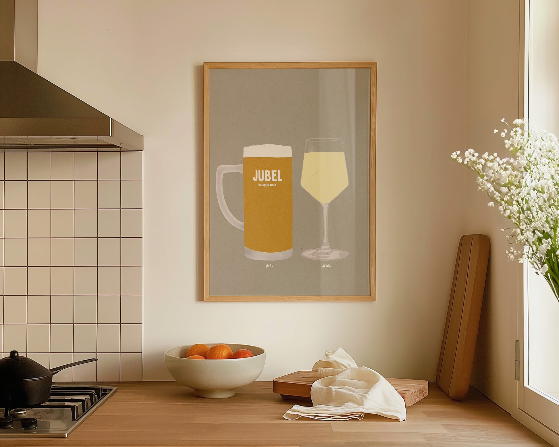 A Jubel & White Wine print featuring hand drawn pint of Jubel alongside a glass of White Wine, set against a pale green/grey background, the perfect modern kitchen print. Printed on archival matte 240gsm paper. Available in multiple sizes, with framed or unframed options. Exclusively designed by one of our artists at our studio.