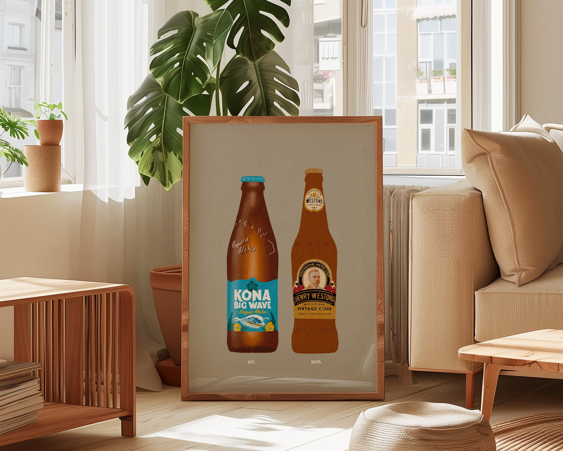 A couples drinks print featuring hand drawn bottle of Kona Big Wave alongside a bottle of Henry Westons cider, set against a pale green/grey background, the perfect modern kitchen print. Printed on archival matte 240gsm paper. Available in multiple sizes, with framed or unframed options. Exclusively designed by one of our artists at our studio.