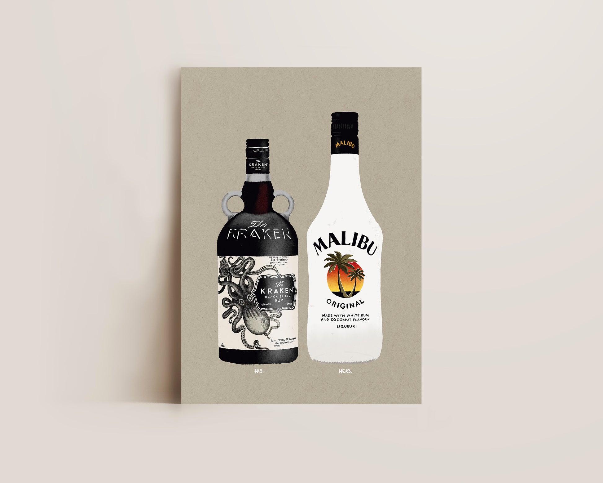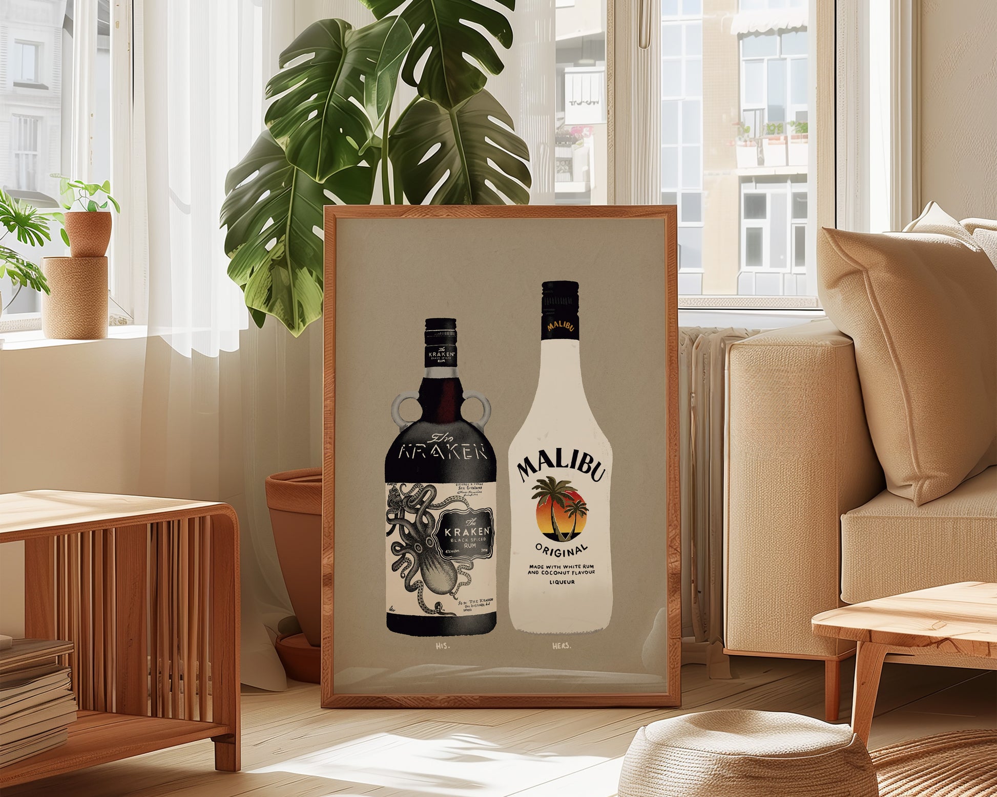 A Kraken & Malibu print featuring hand drawn bottle of Kraken rum alongside a bottle of Malibu, set against a pale green/grey background, the perfect modern kitchen print. Printed on archival matte 240gsm paper. Available in multiple sizes, with framed or unframed options. Exclusively designed by one of our artists at our studio.