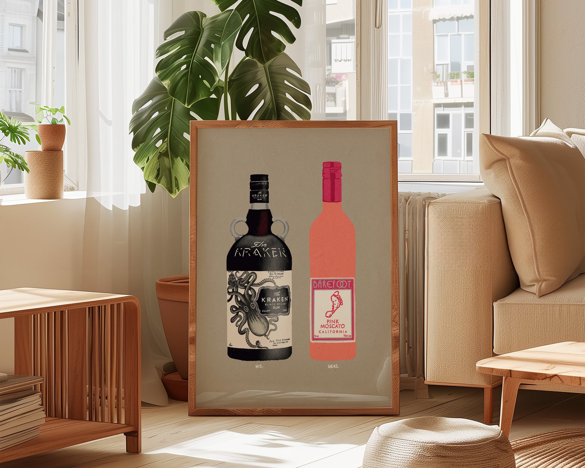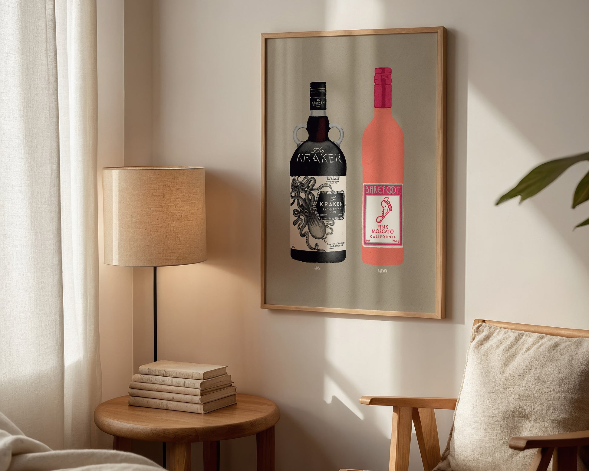 A Rum & Wine print featuring hand drawn bottle of Kraken alongside a bottle of Pink Moscato, set against a pale green/grey background, the perfect modern kitchen print. Printed on archival matte 240gsm paper. Available in multiple sizes, with framed or unframed options. Exclusively designed by one of our artists at our studio.