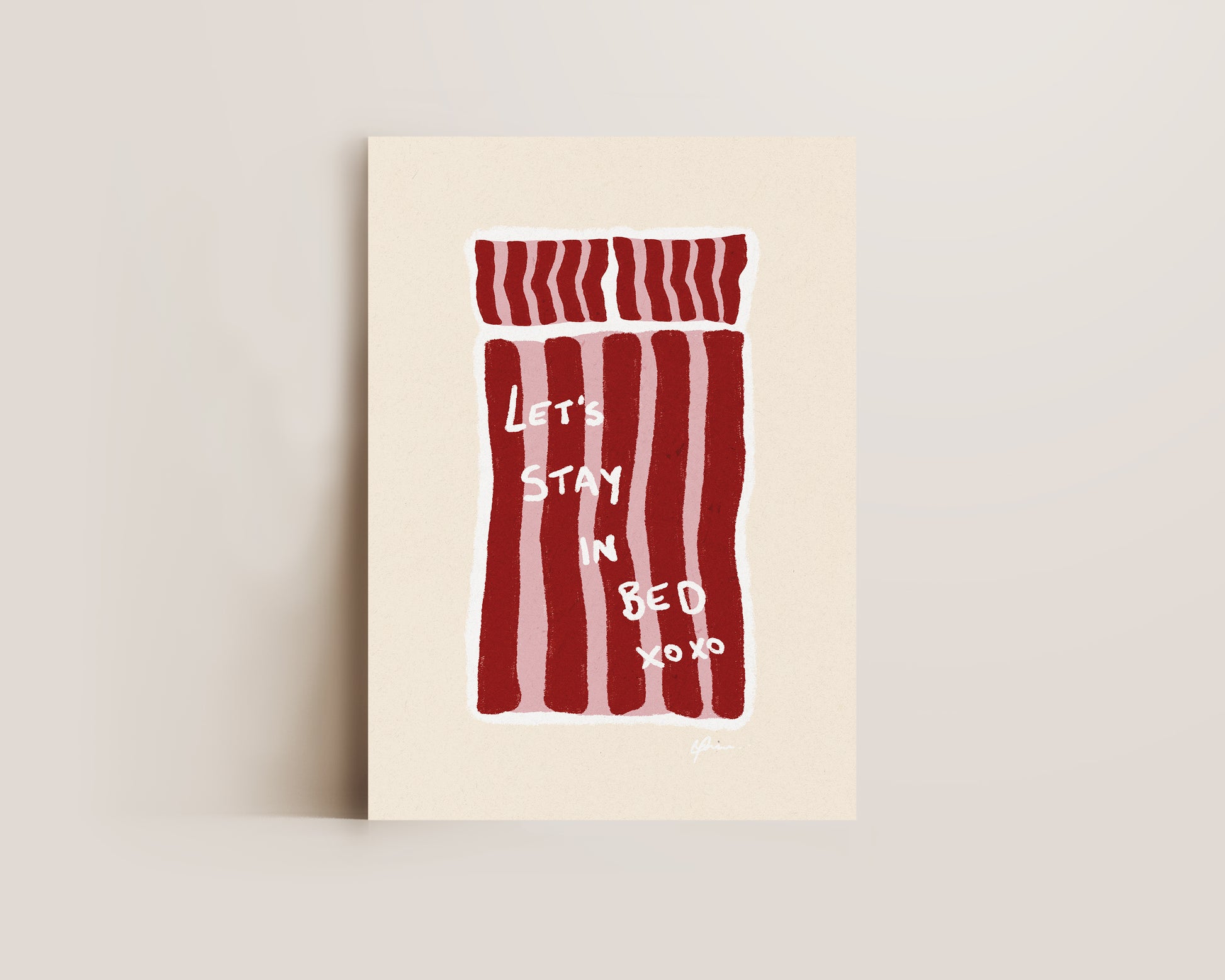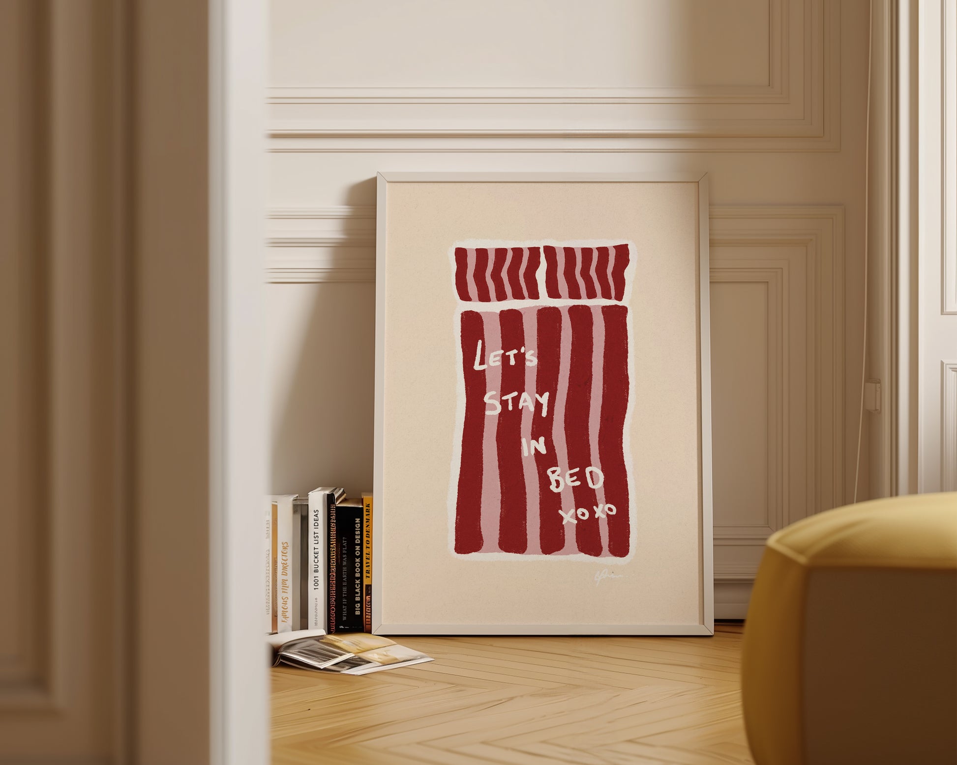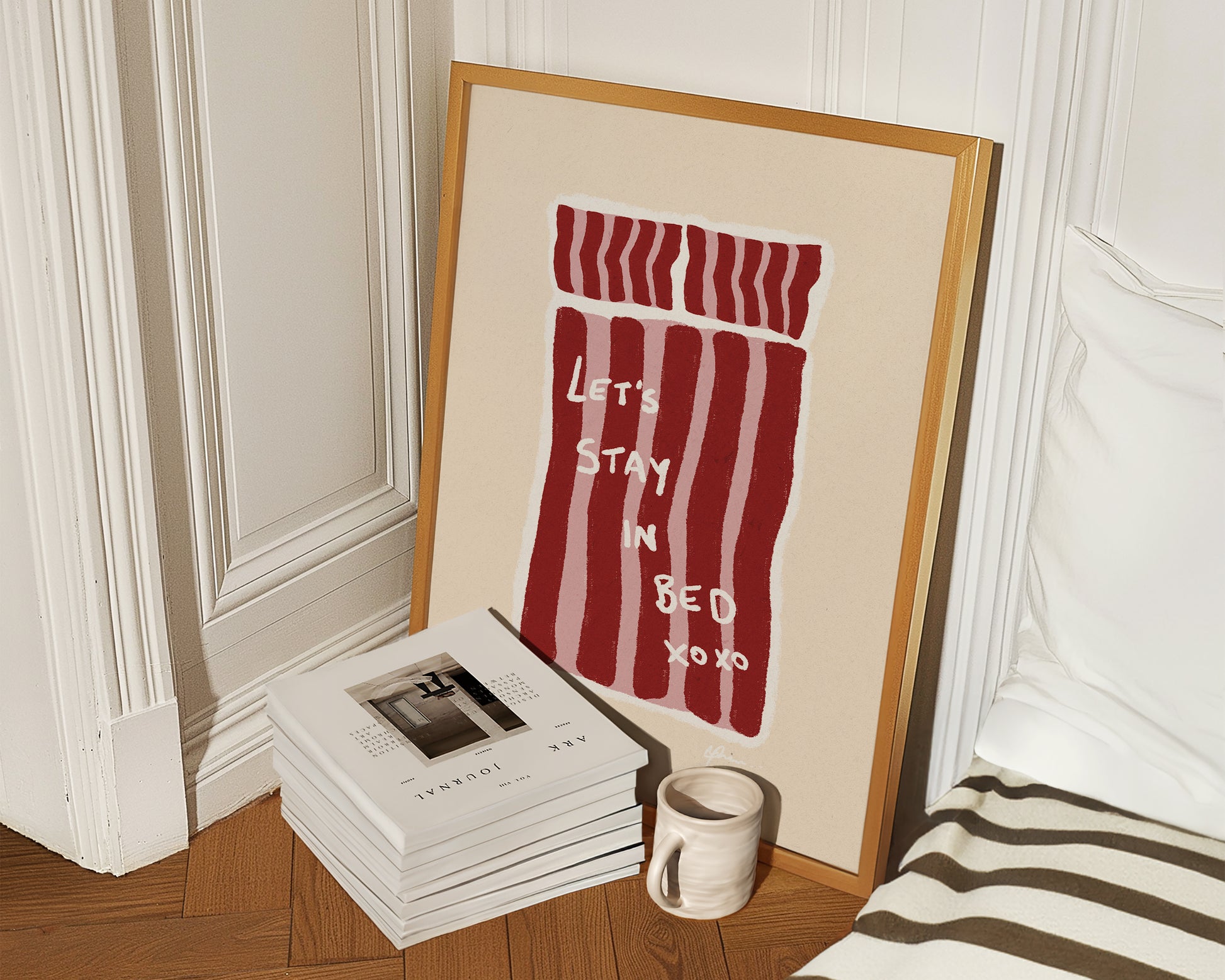 A let's stay in bed print featuring a hand drawn oil pastel duvet and pillows with "Let's Stay In Bed xoxo" quote, against a neutral beige background. The perfect bedroom poster for modern apartments. Printed on archival matte 240gsm paper. Available in multiple sizes, with framed or unframed options. Exclusively designed by one of our artists at our studio