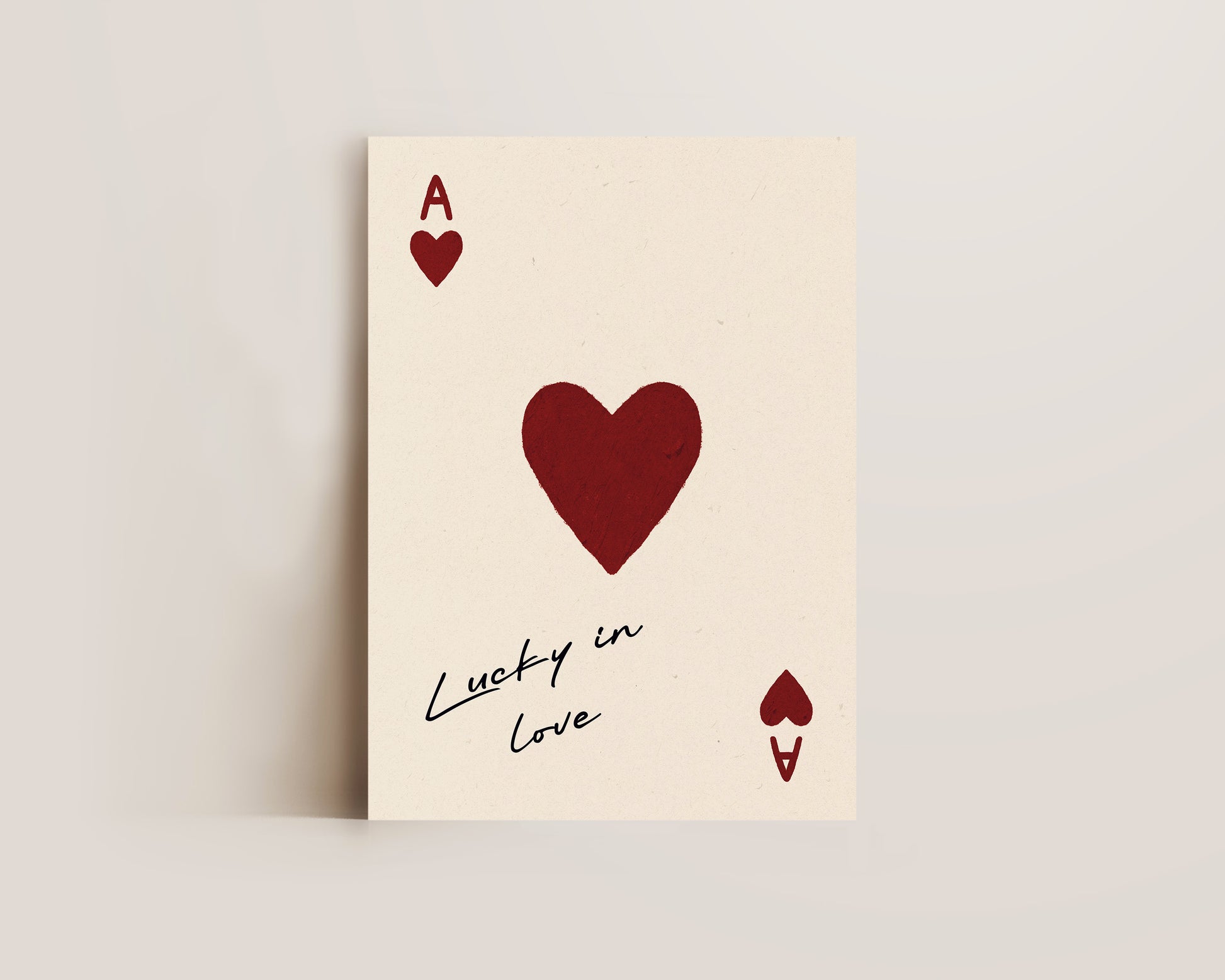 A playing card print featuring a hand drawn oil pastel ace of hearts with "Lucky In Love" quote, against a neutral beige background. The perfect bedroom poster for modern apartments. Printed on archival matte 240gsm paper. Available in multiple sizes, with framed or unframed options. Exclusively designed by one of our artists at our studio