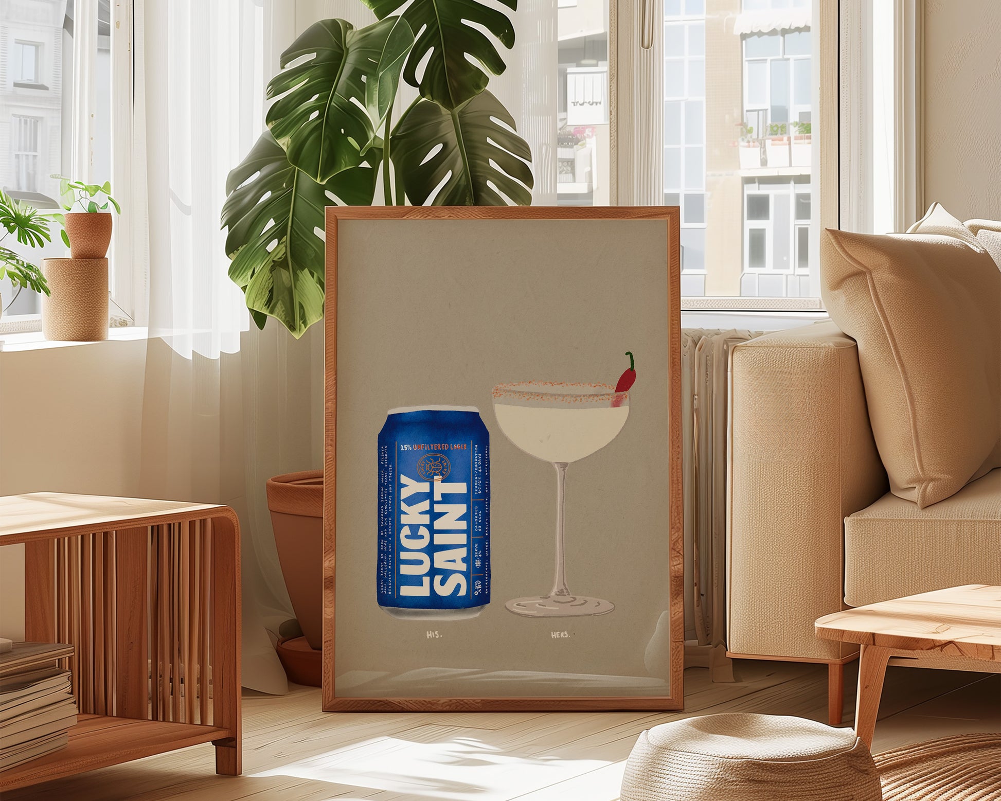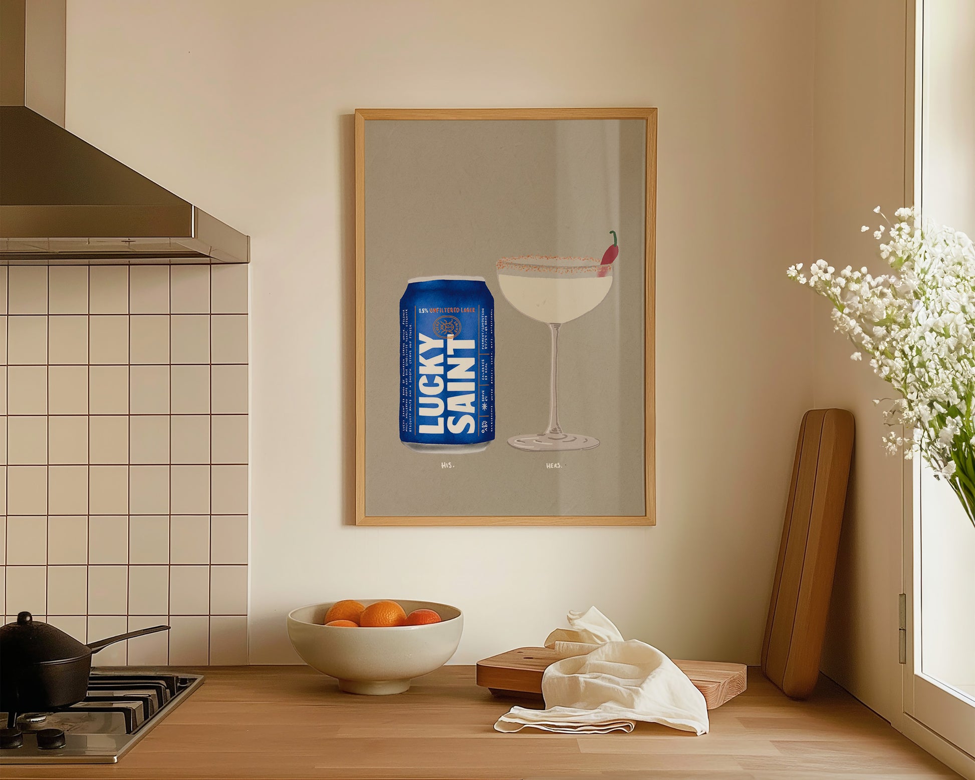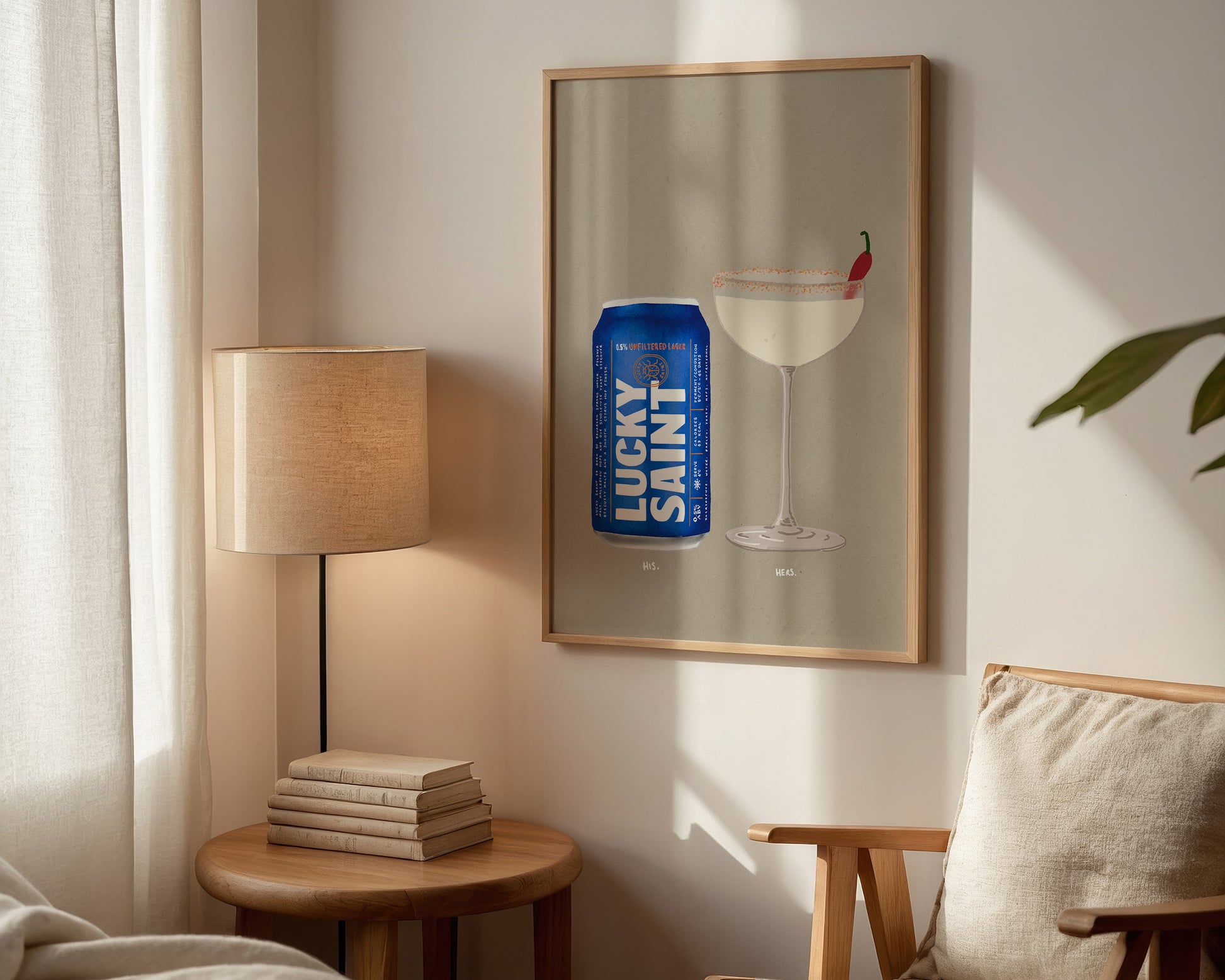 A Lucky Saint & Spicy Marg print featuring hand drawn can of non-alcoholic Lucky Saint beer alongside a Spicy Marg cocktail, set against a pale green/grey background, the perfect modern kitchen print. Printed on archival matte 240gsm paper. Available in multiple sizes, with framed or unframed options. Exclusively designed by one of our artists at our studio.