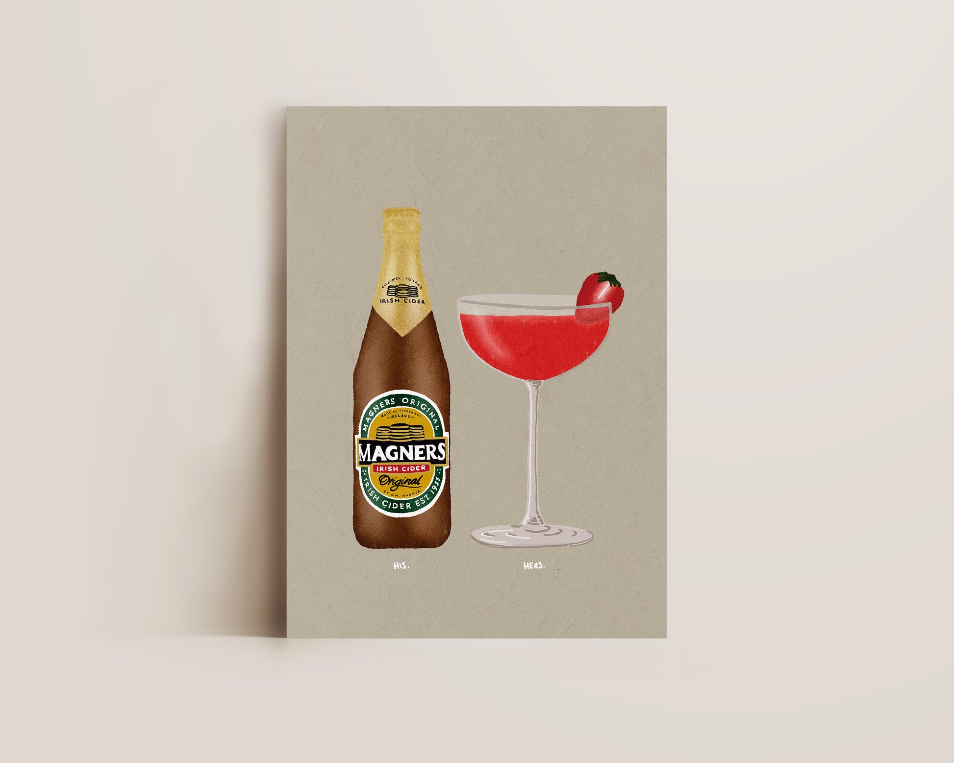 A Magners & Strawberry Daiquiri print featuring hand drawn bottle of Magners alongside a Strawberry Daiquiri cocktail, set against a pale green/grey background, the perfect modern kitchen print. Printed on archival matte 240gsm paper. Available in multiple sizes, with framed or unframed options. Exclusively designed by one of our artists at our studio.