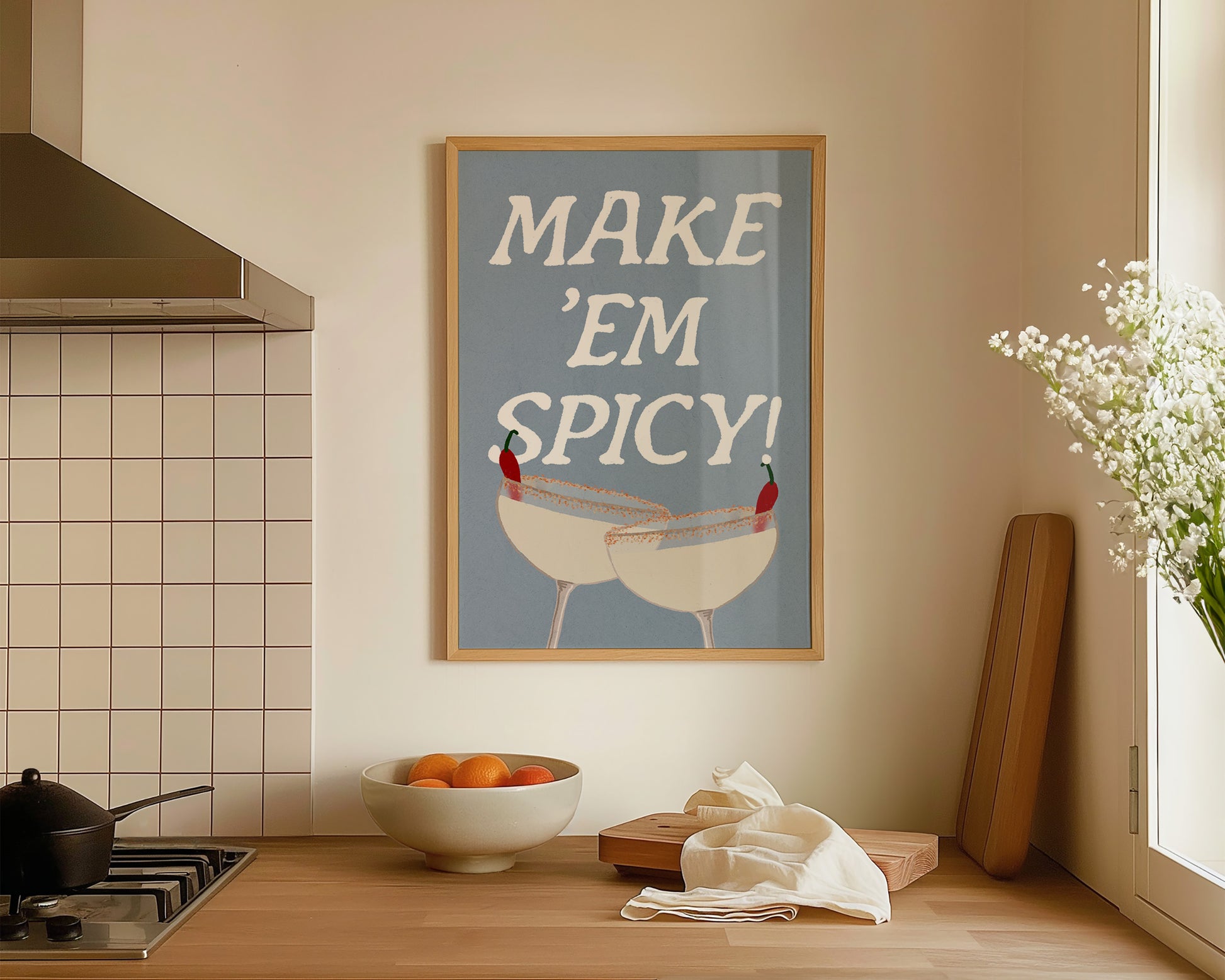 A cocktail print featuring hand drawn spicy marg cocktails, set against a blue background, the perfect modern kitchen print. Printed on archival matte 240gsm paper. Available in multiple sizes, with framed or unframed options. Exclusively designed by one of our artists at our studio.