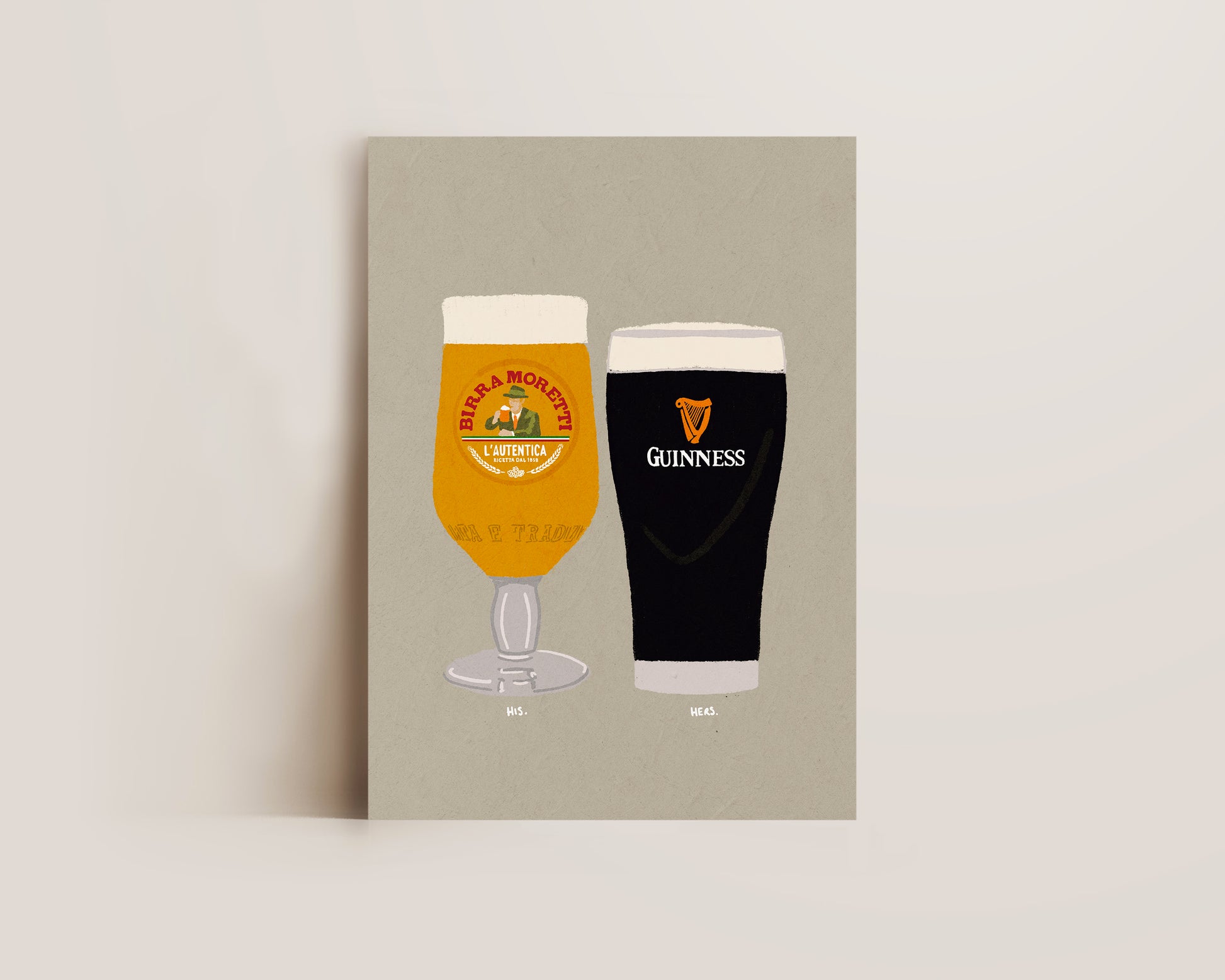 A Moretti and Guinness print featuring hand drawn pint of Moretti alongside a pint of Guinness, set against a pale green/grey background, the perfect modern kitchen print. Printed on archival matte 240gsm paper. Available in multiple sizes, with framed or unframed options. Exclusively designed by one of our artists at our studio.